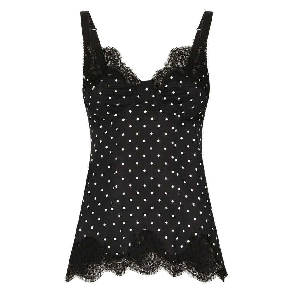 Black/white stretch-silk satin weave polka dot print lace trim sweetheart neck adjustable shoulder straps underwire cup concealed rear zip fastening unlined scallop hem