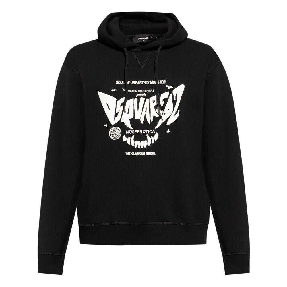 Black/white cotton jersey texture logo print to the front drawstring hood drop shoulder long sleeves ribbed cuffs and hem straight hem