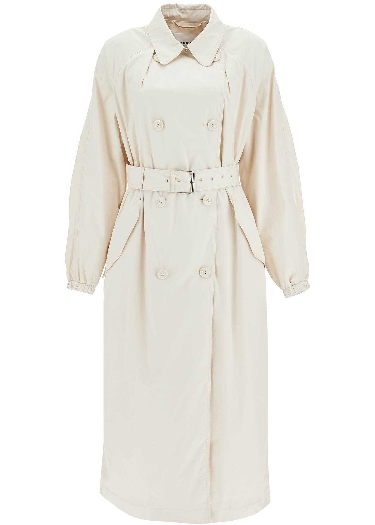 Crafted from lightweight organic cotton and recycled nylon blend fabric, this long trench coat by Marant Etoile features a fitted flared silhouette cinched at the waist with a matching buckle belt and finished with a deep center back slit. Designed with a double-breasted closure of eight buttons, it also has a convertible rounded collar with a throat latch hook, raglan sleeves with elasticated cuffs, and slanted flap pockets. Unlined and detailed with a storm flap on the back. The model