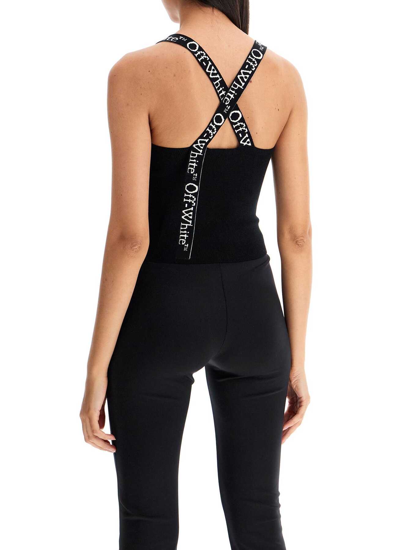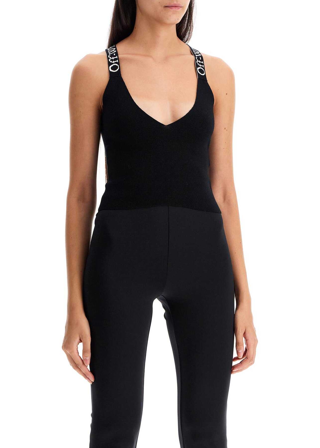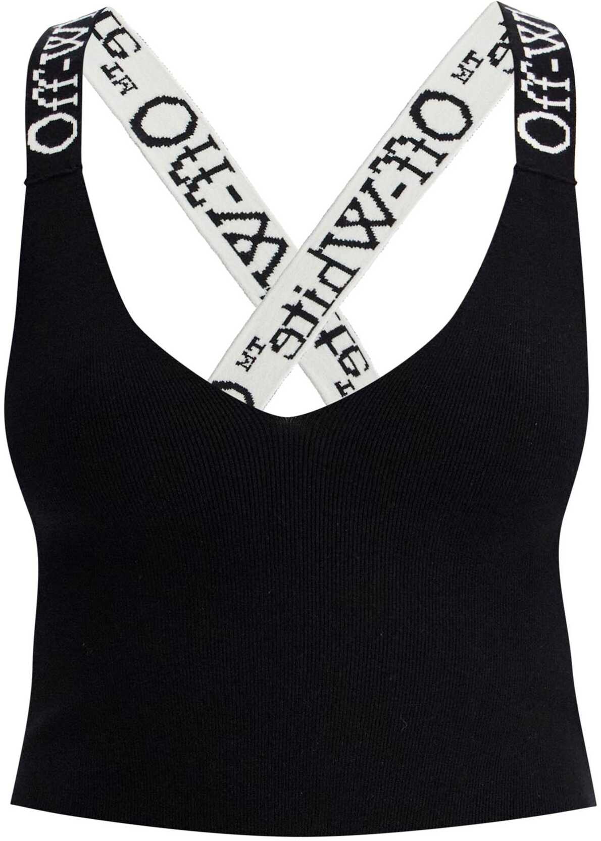 This Off-White sleeveless crop top is made of a thin ribbed knit fabric blend, featuring criss-cross straps on the back adorned with a contrasting jacquard logo. It has a deep V-neckline and a fitted silhouette. The model is 177 cm tall and wears a size S.
