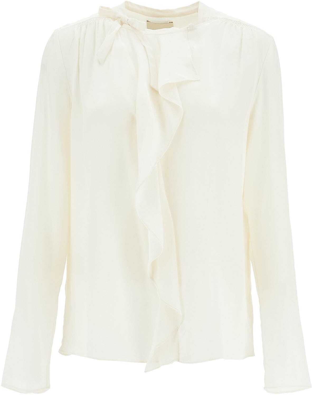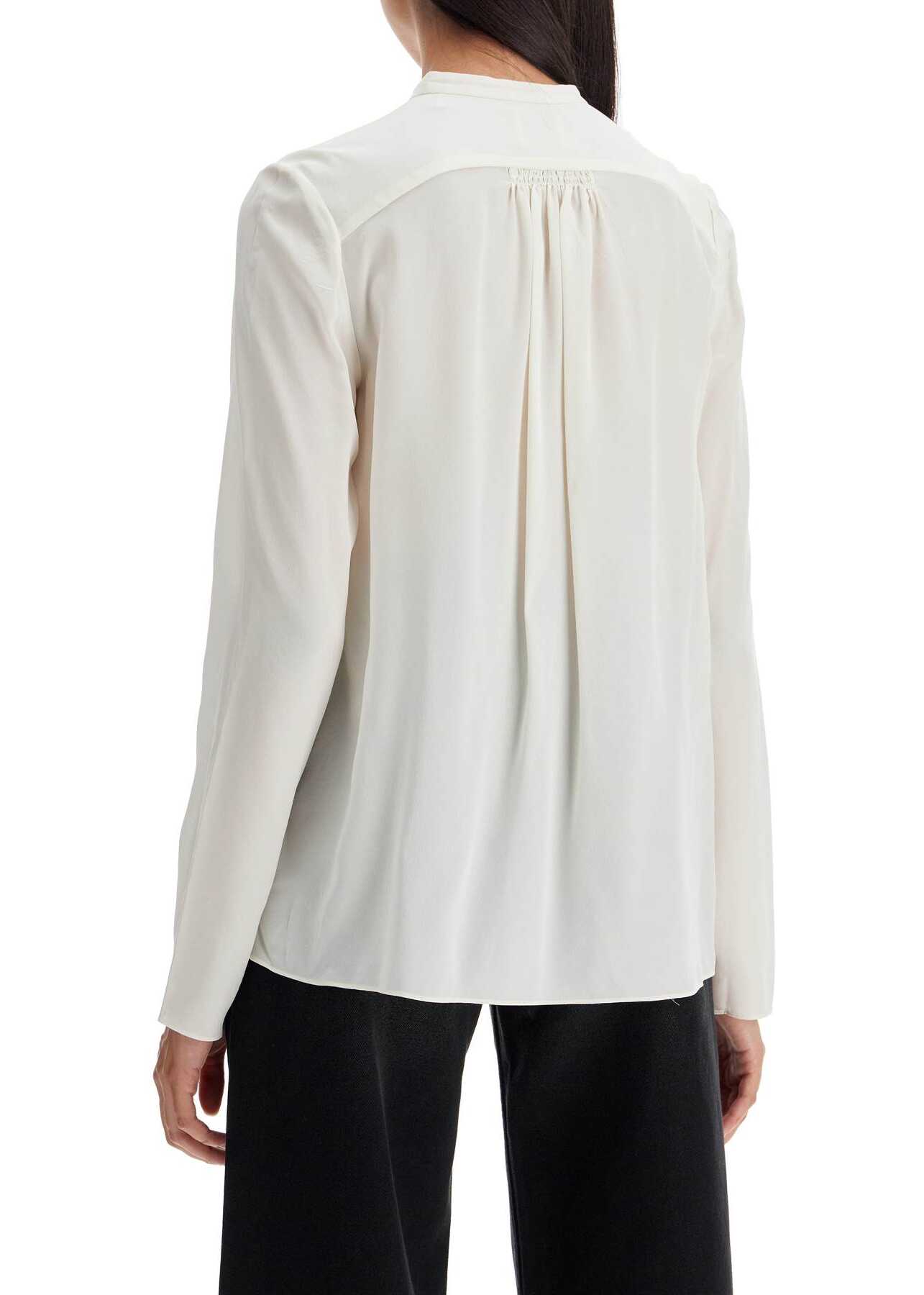 This relaxed fit blouse by Isabel Marant is made from pure silk crepe de chine. It features a standing collar with tie closures and a front ruffle detail with a covered button. Finished with gathers on the shoulders and at the back of the neck. The model is 177 cm tall and wears a size FR 36.