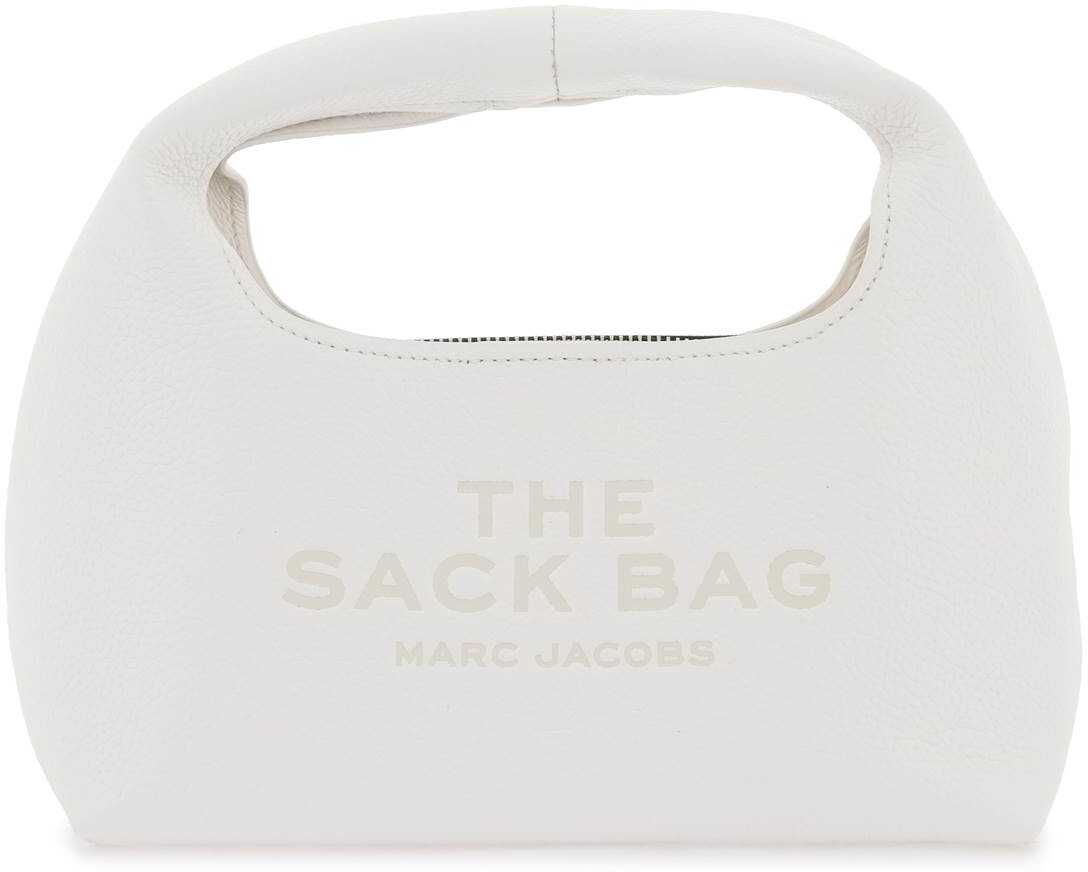 The Mini Sack Bag by Marc Jacobs crafted in grained leather featuring embossed lettering and logo at front and iconic tonal logo patch at back. Magnetic closure, interior fabric pouch with zip closure, top handle. SIlver-finished metalware.