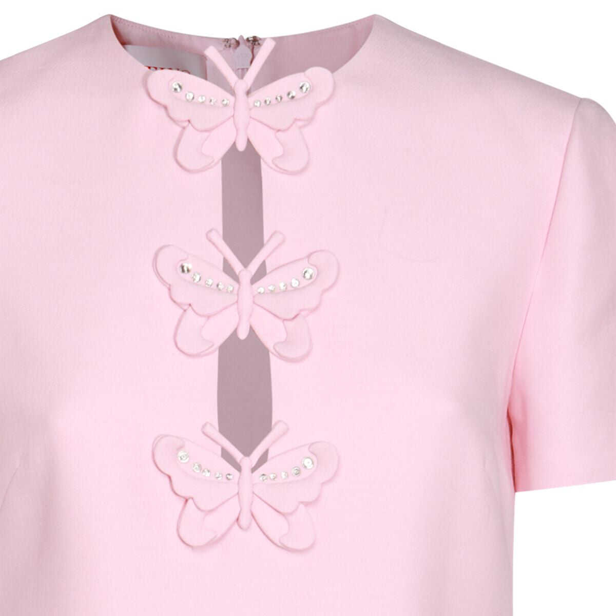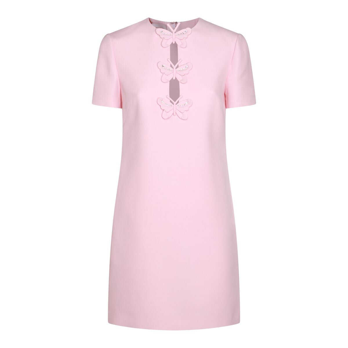 Pink wool mini dress from Valentino featuring short sleeves, round collar, frontal embroidered, back fastening and mini length.