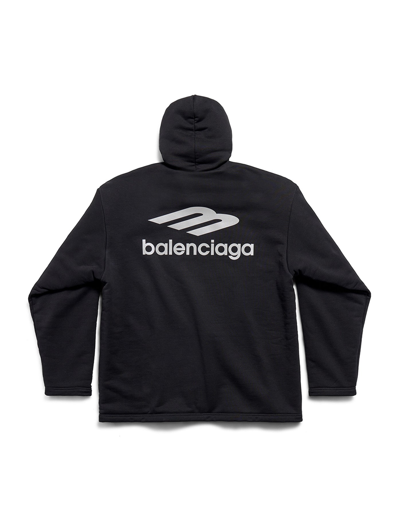 Balenciaga’s black cotton hoodie featuring a fixed hood, dropped shoulders and logo printed on the chest, sleeves and back.