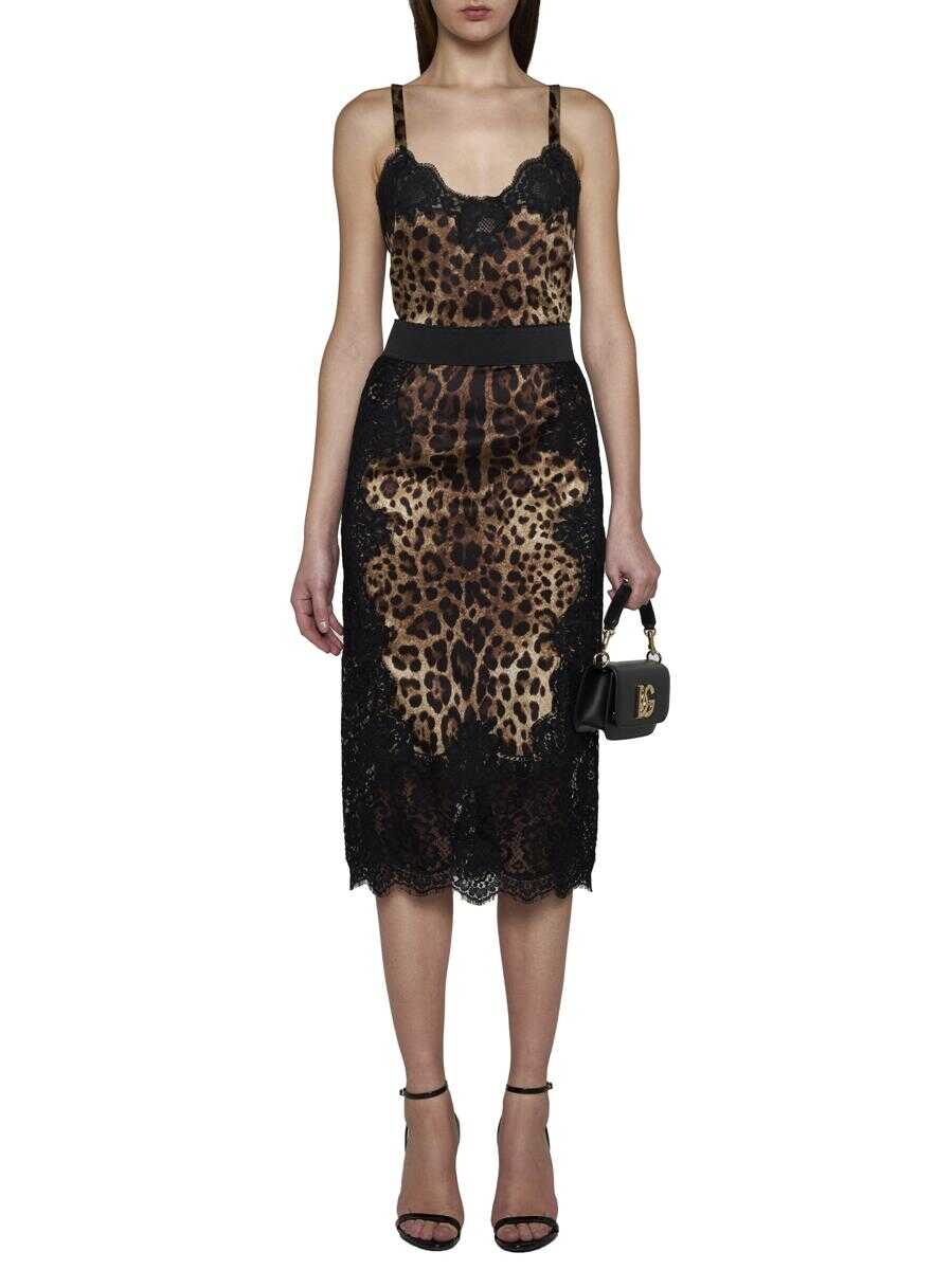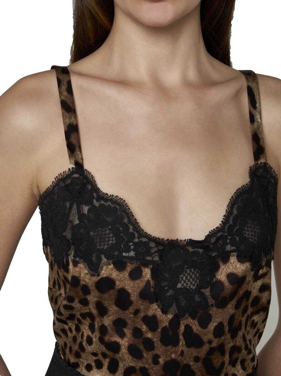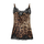 Dolce & Gabbana’s leopard print silk camisole in shades of brown featuring spaghetti straps and black lace along the neckline and hem.