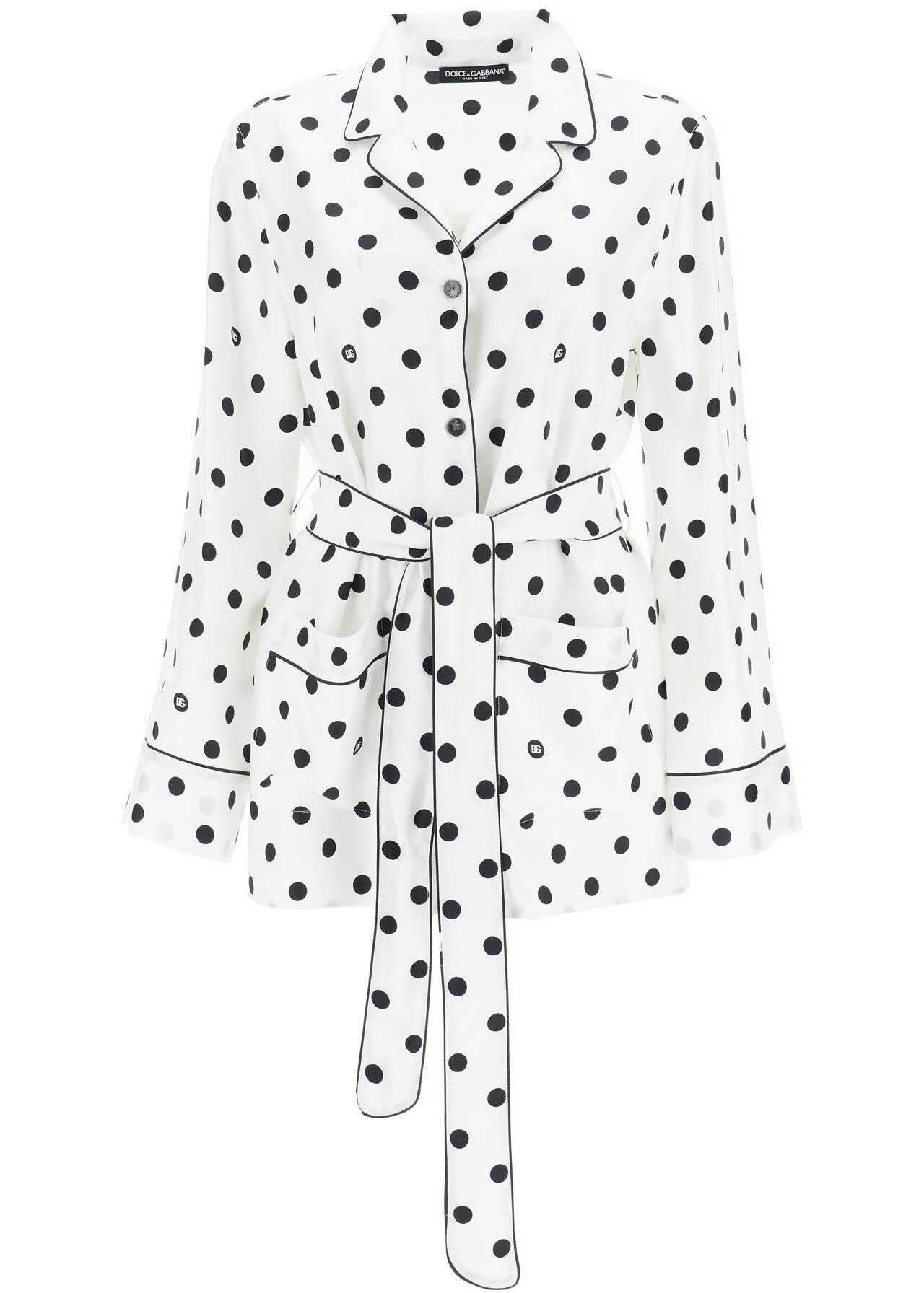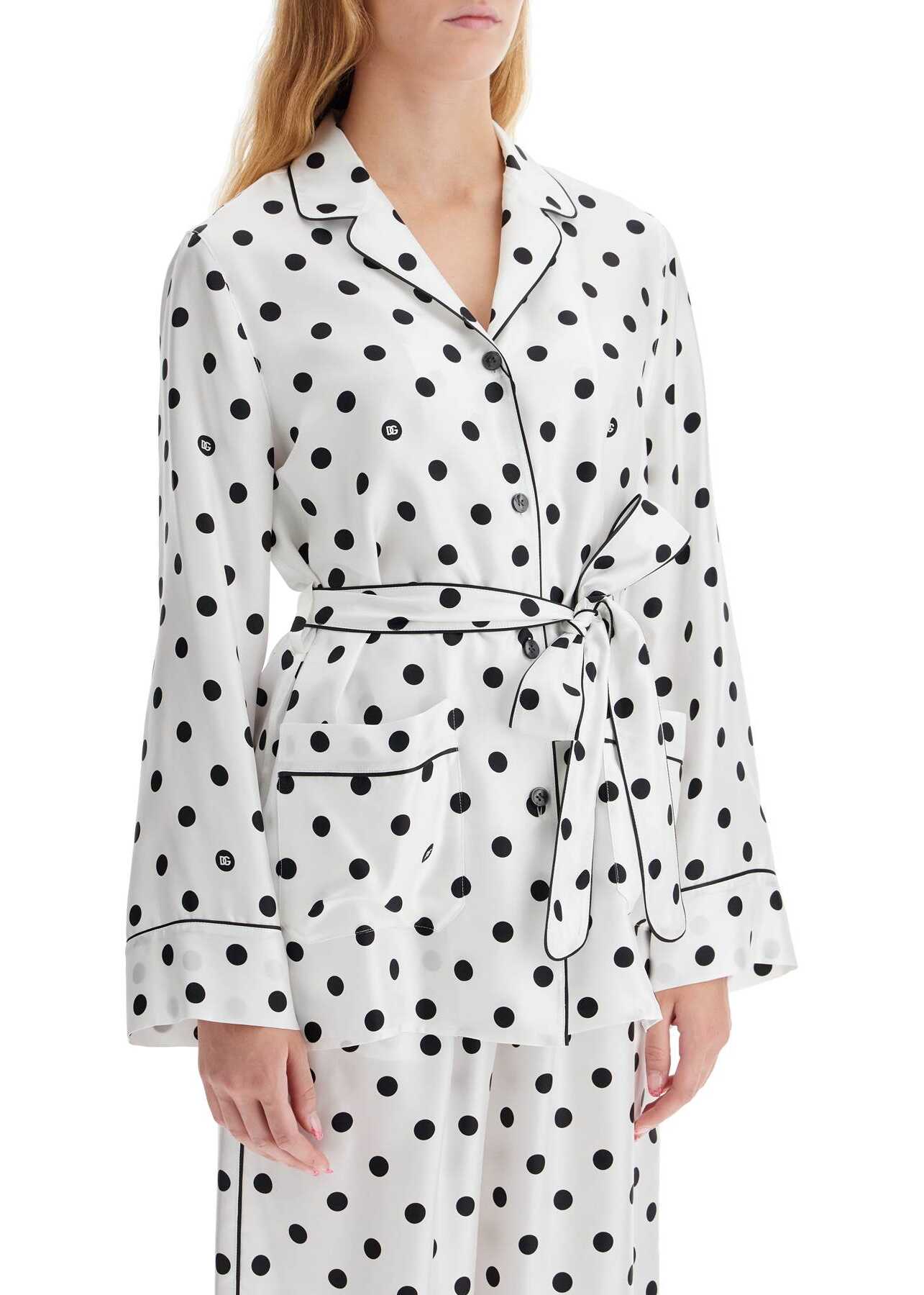 This Dolce & Gabbana pajama shirt is made of silk twill with a polka dot print. It features a notched collar, front button closure, and a waist belt to enhance the silhouette. The model is 177 cm tall and wears an Italian size 40.
