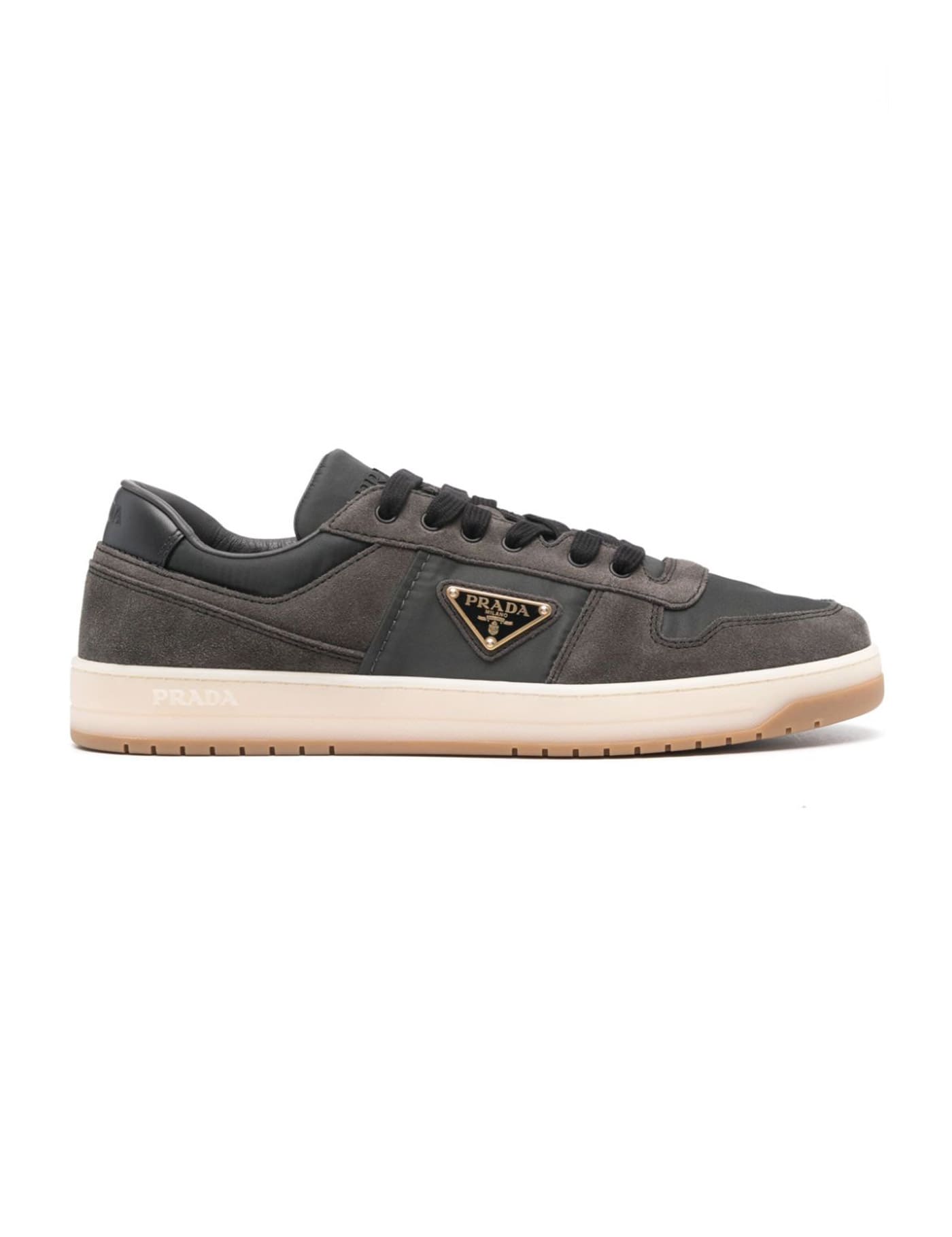 Calfskin Downtown Sneakers by Prada, panelled suede design, a lace-up front fastening, a round perforated toe, an iconic enameled triangular brand signature plaque applied to the outer side panel, a branded heel and front label, a flat sole, and a two-tone pattern.