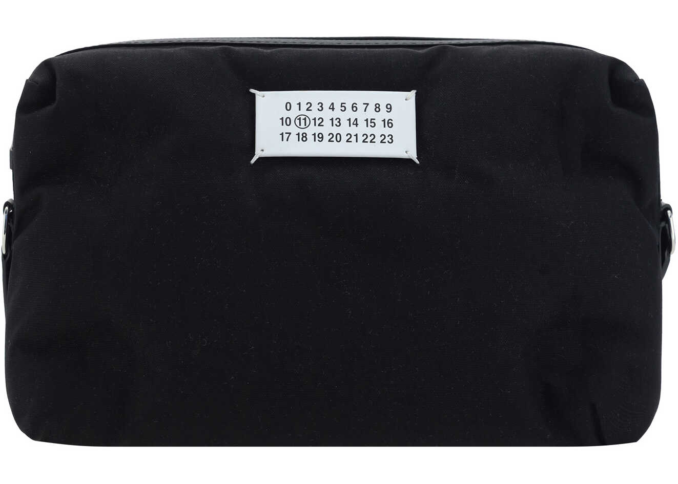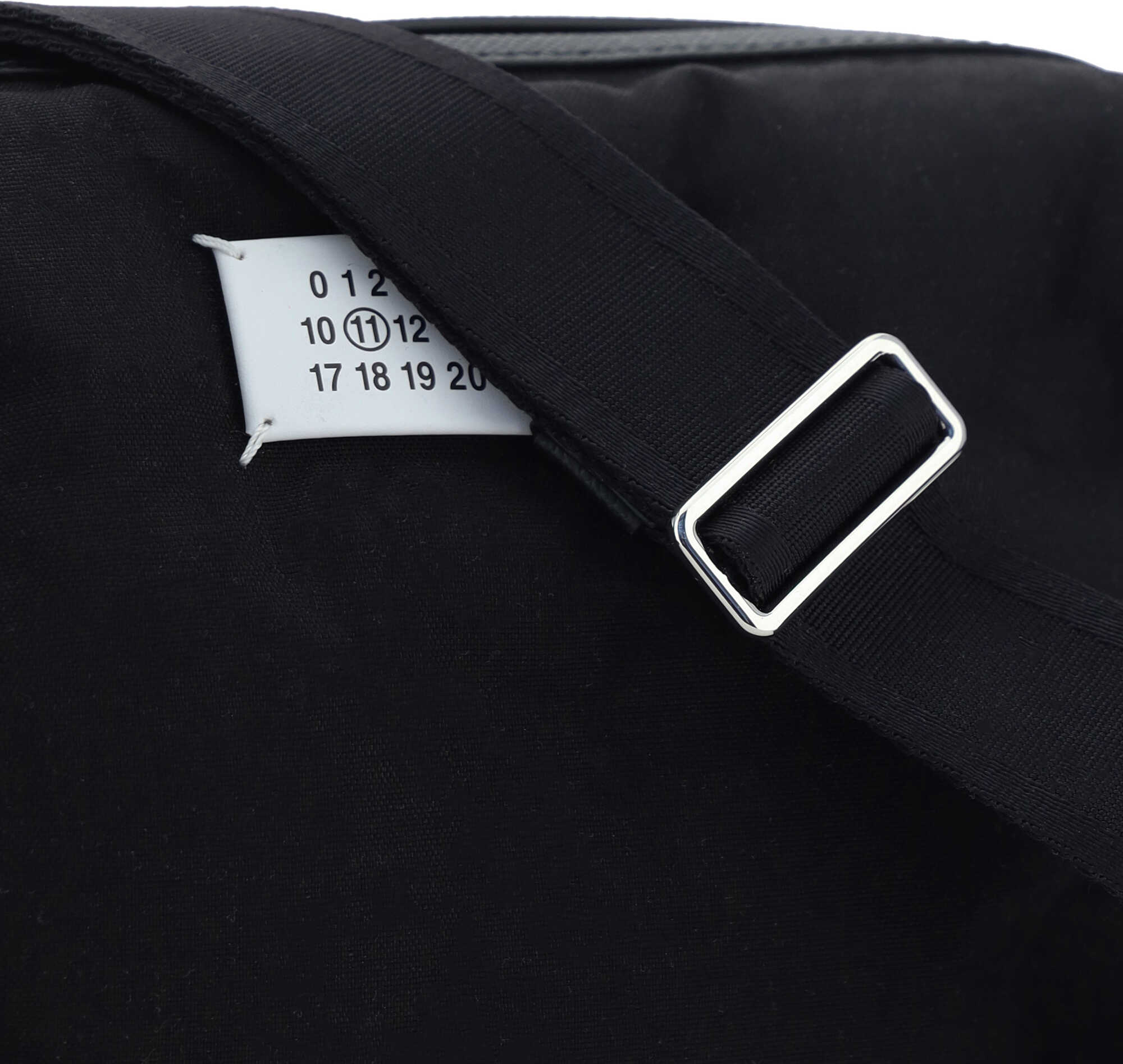 Nylon Glam Slam Sport Shoulder Bag by Margiela, knurled calfskin leather inserts enhanced with contrasting logo label on front, adjustable tonal fabric shoulder strap, zipper closure, one zipper pocket on back.