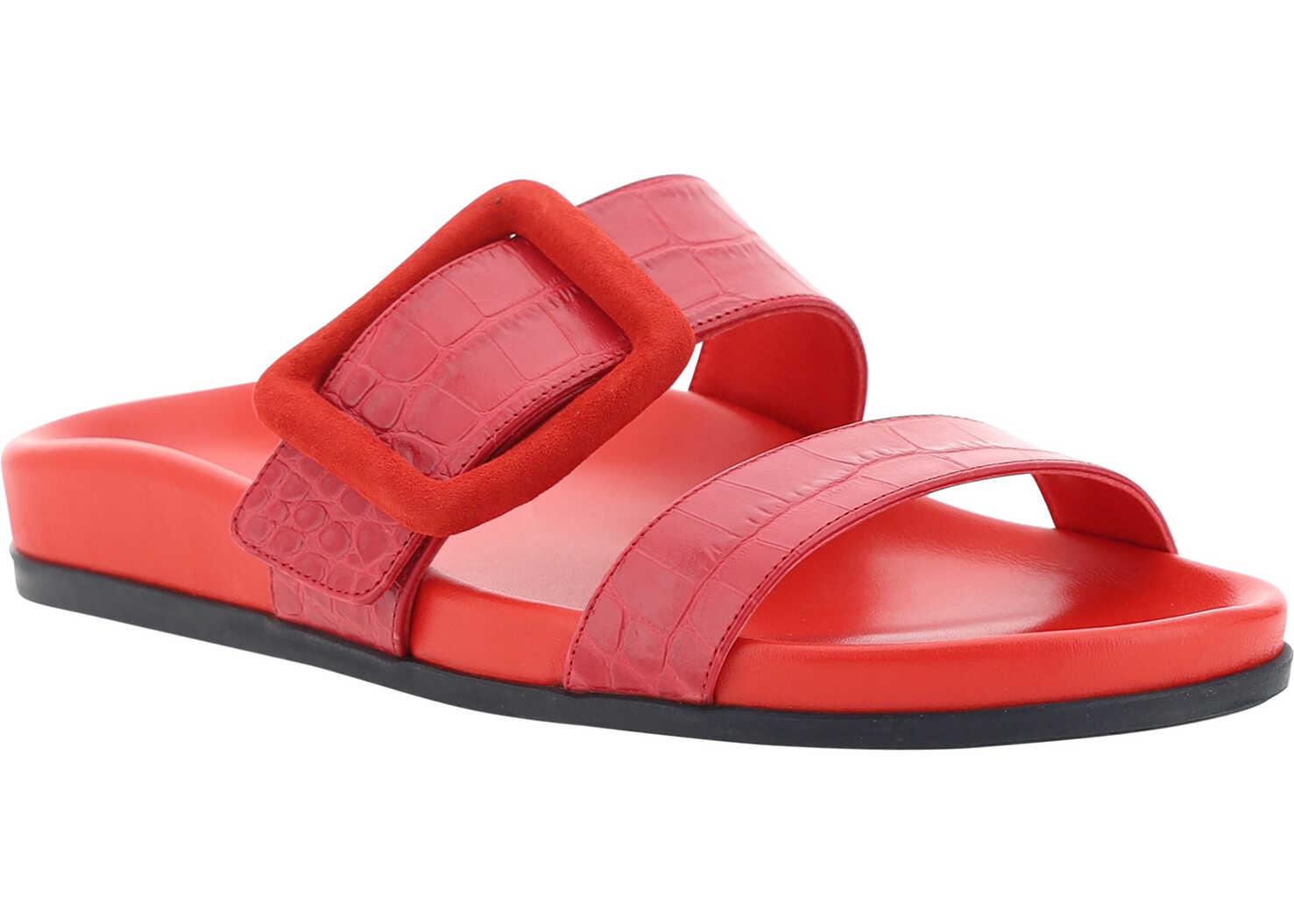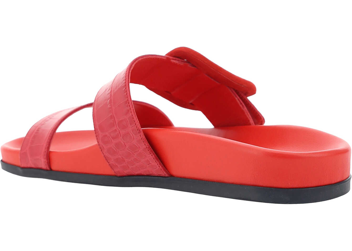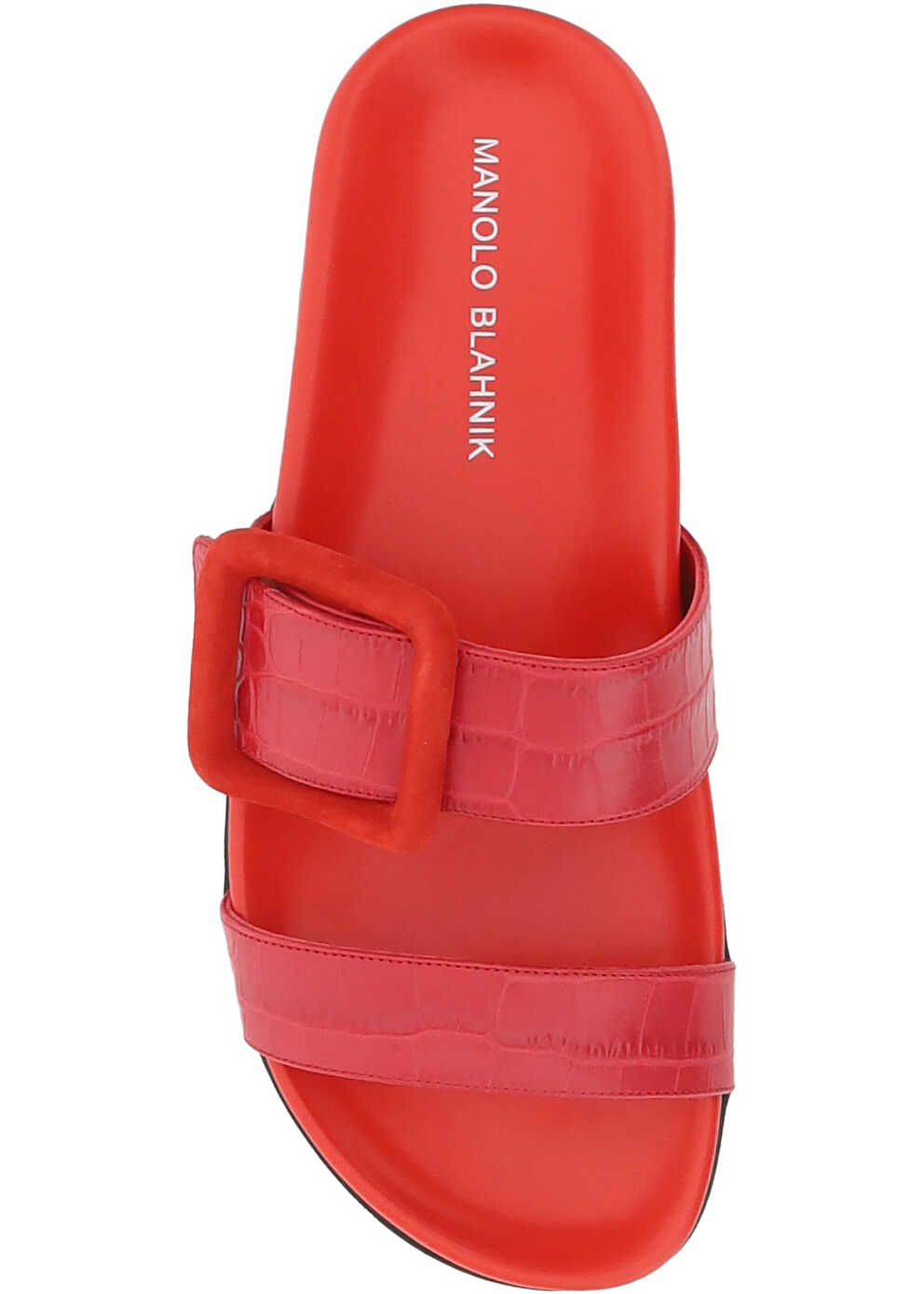 Calfskin Mayfu Sandals by Manolo Blahnik, featuring a double strap at the back, a flat sole, a croc-effect leather design, a round toe, a rectangular embossed applique buckle at the front, and a contrasting logo-embossed insole.