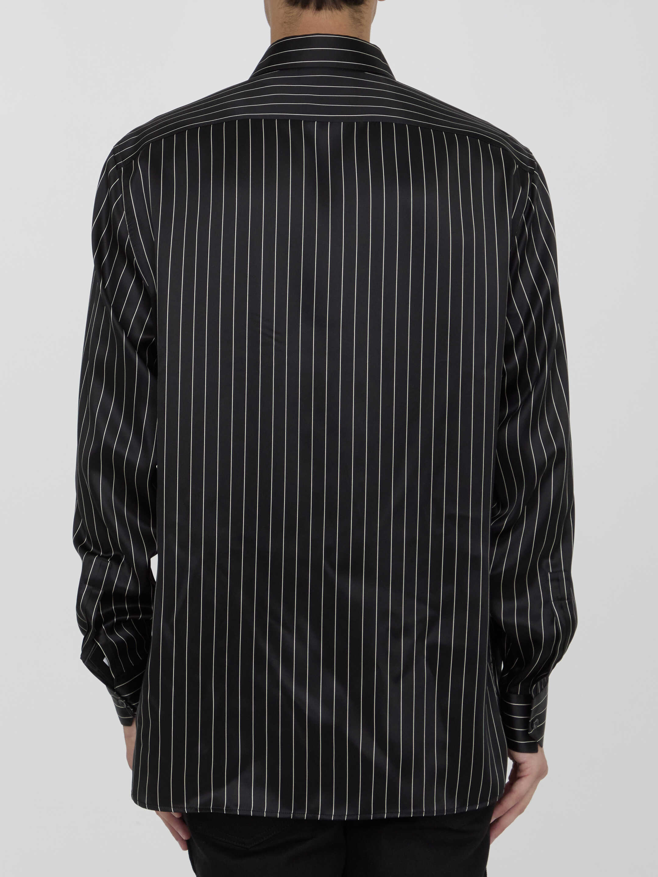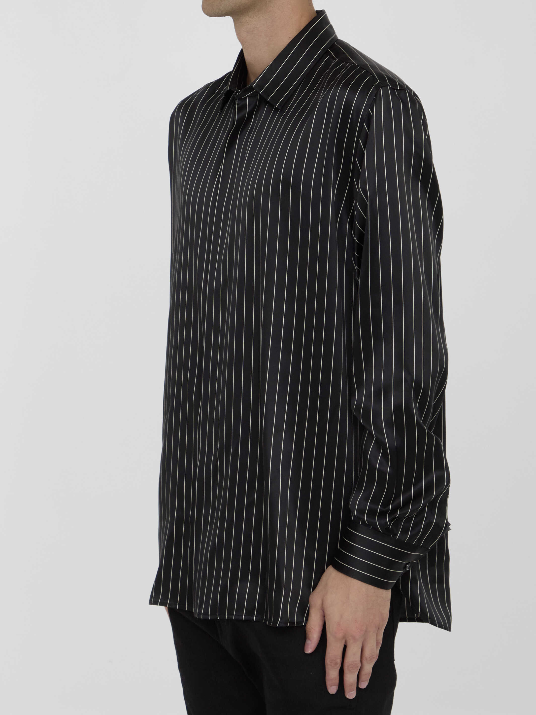 Long-sleeved shirt in black silk satin with off-white stripes. It features pointed Yves collar, front concealed button closure and single-button cuffs. Regular fit.