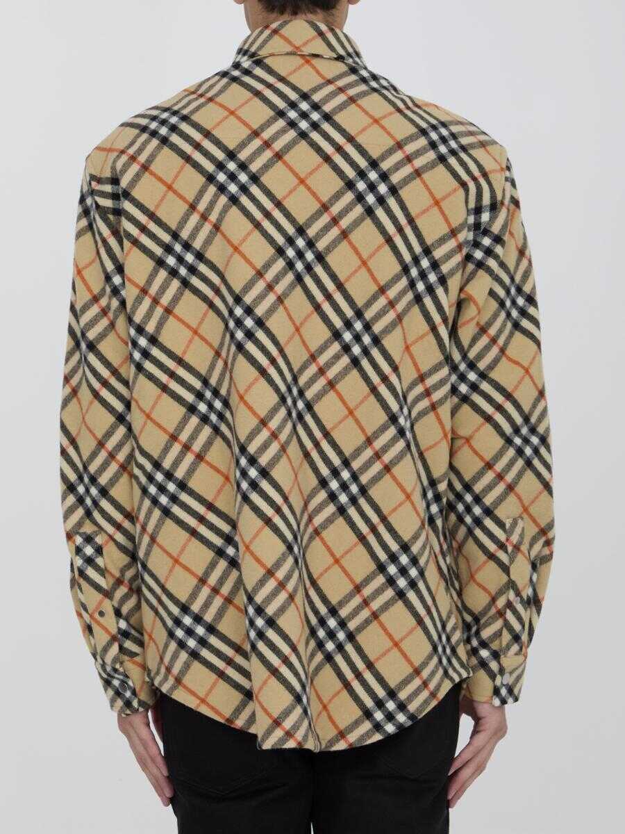 Wool flannel shirt with Burberry Check motif. It features pointed collar, front press-stud closure, one press-stud patch pocket on chest, single-button cuffs and curved hem. Oversized fit.