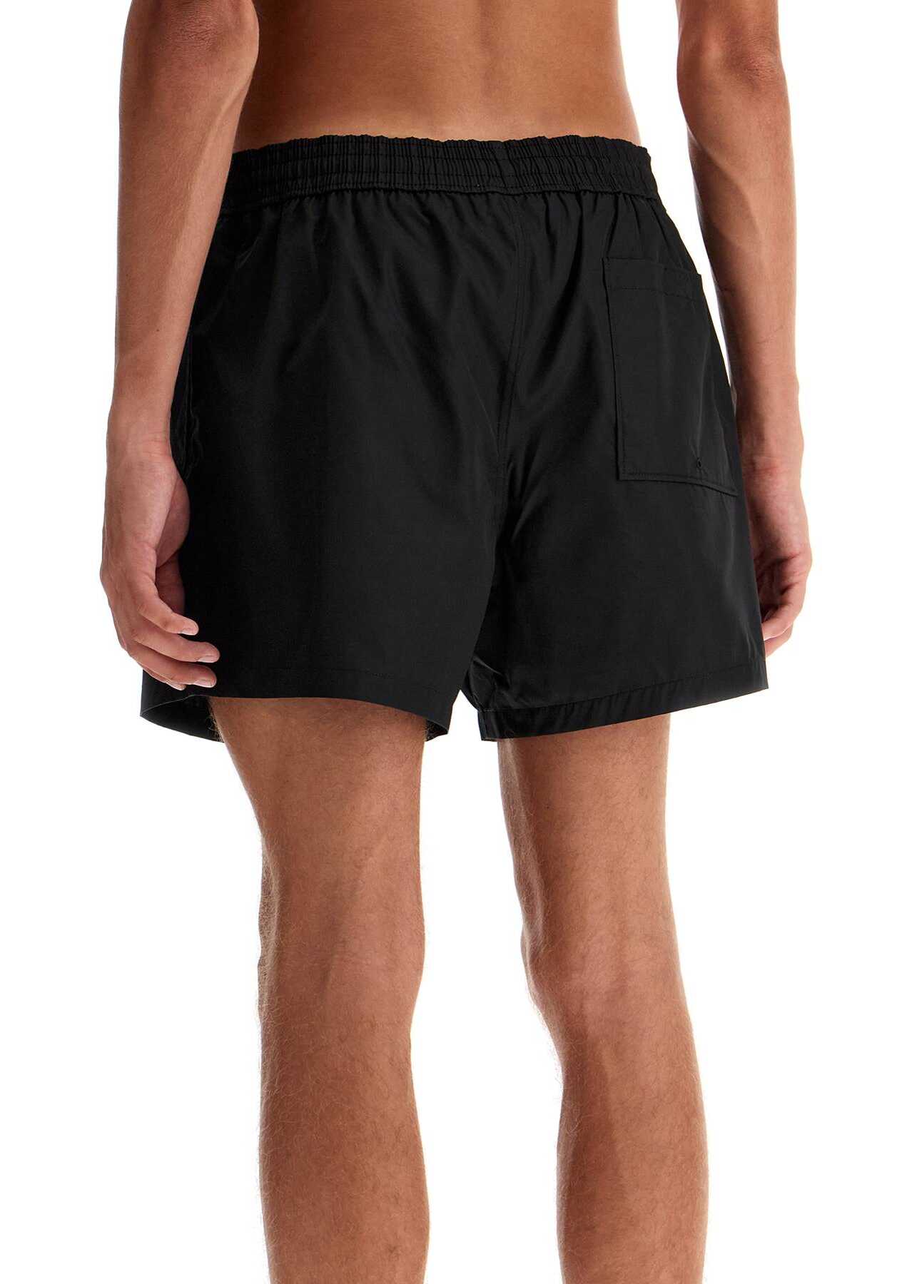 Off-White nylon Bermuda shorts for women, featuring a soft cut with an adjustable elastic waistband internally with drawstring. Equipped with three pockets and an inner mesh lining, they feature printed logo designs on the left side and back pocket. The model is 187 cm tall and wears size L.