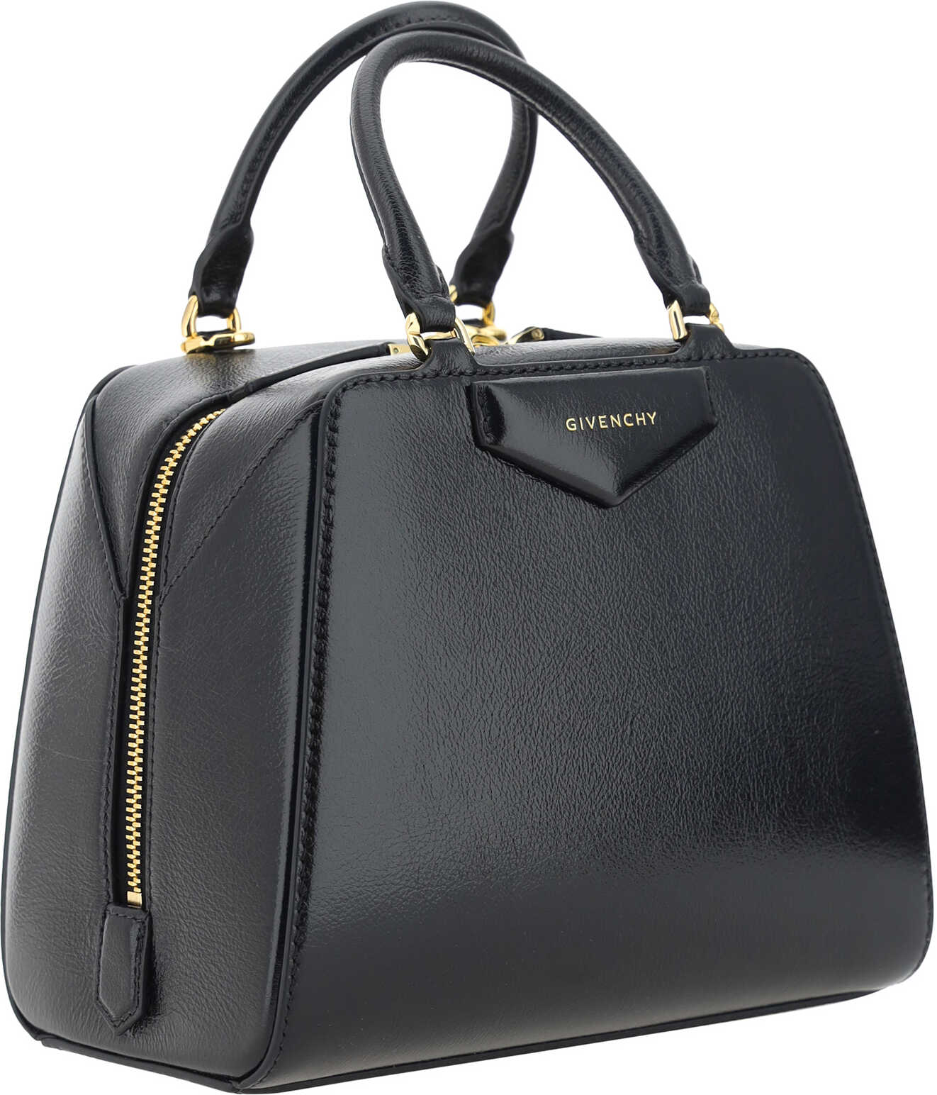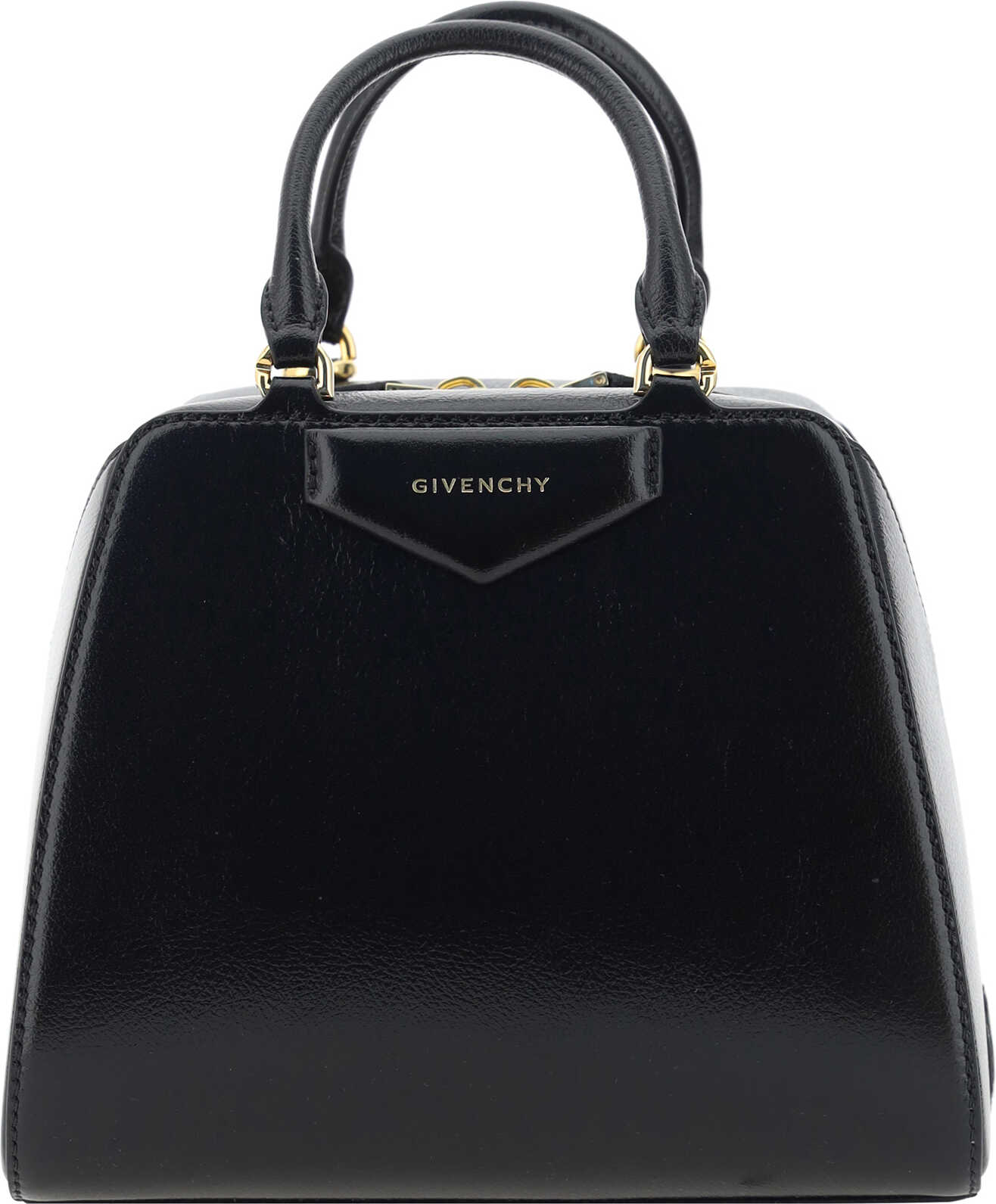 Bufalo Leather Antigona Cube Mini Handbag by Givenchy, grained leather design, geometric pattern, two rigid top handles, top zipper closure with double slider, contrasting iconic brand monogram on front, adjustable and removable shoulder strap, applied support feet at base of bag, iconic three-dimensional brand monogram on front panel.