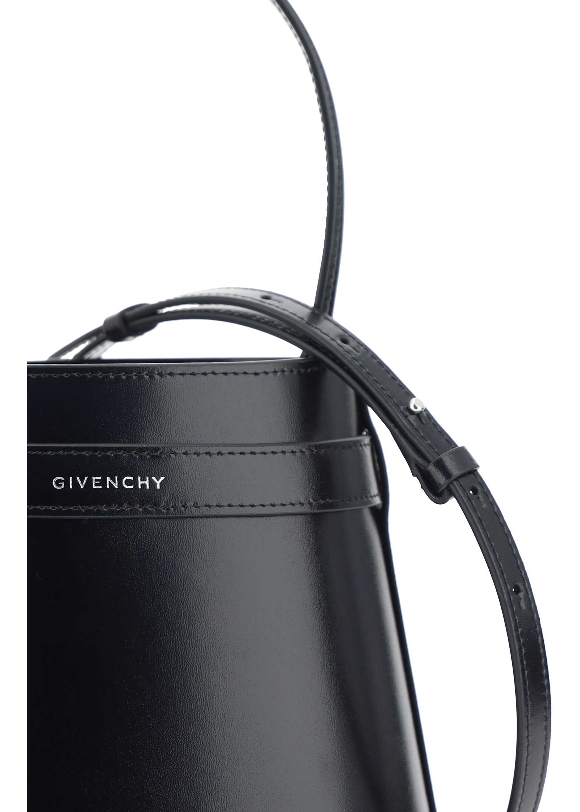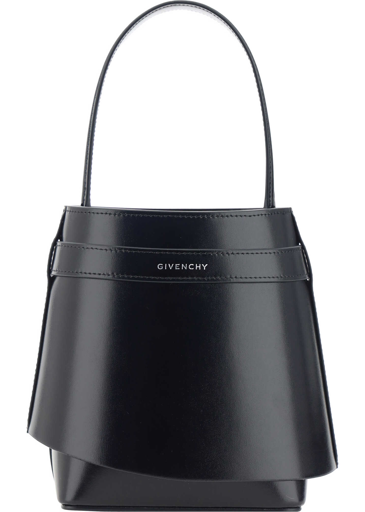 Leather Shark Lock Bucket Bag by Givenchy, leather handles, adjustable and removable thin leather shoulder strap for shoulder or crossbody wear, leather band with metal clasp and silver-finish 4G padlock, single main compartment.