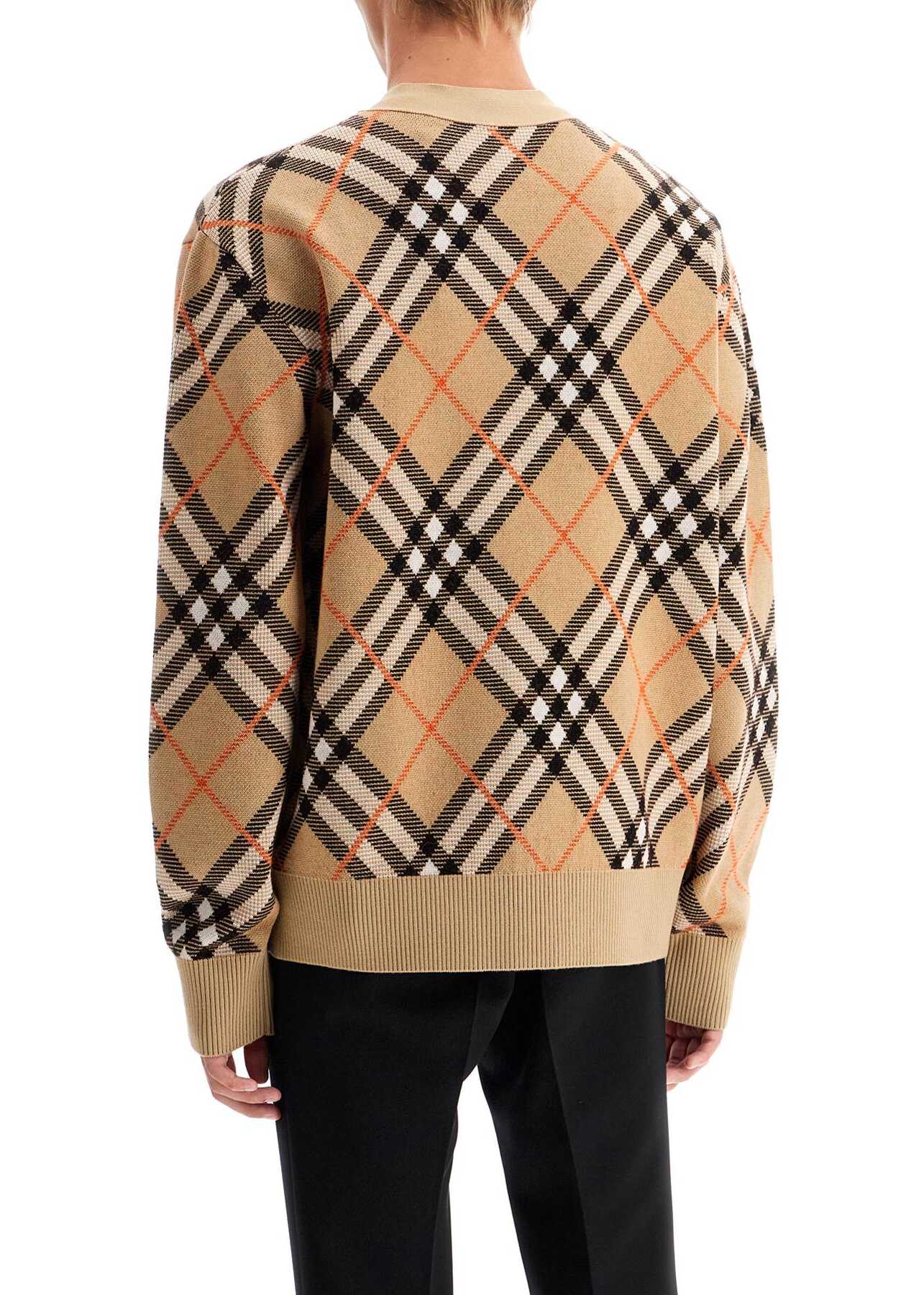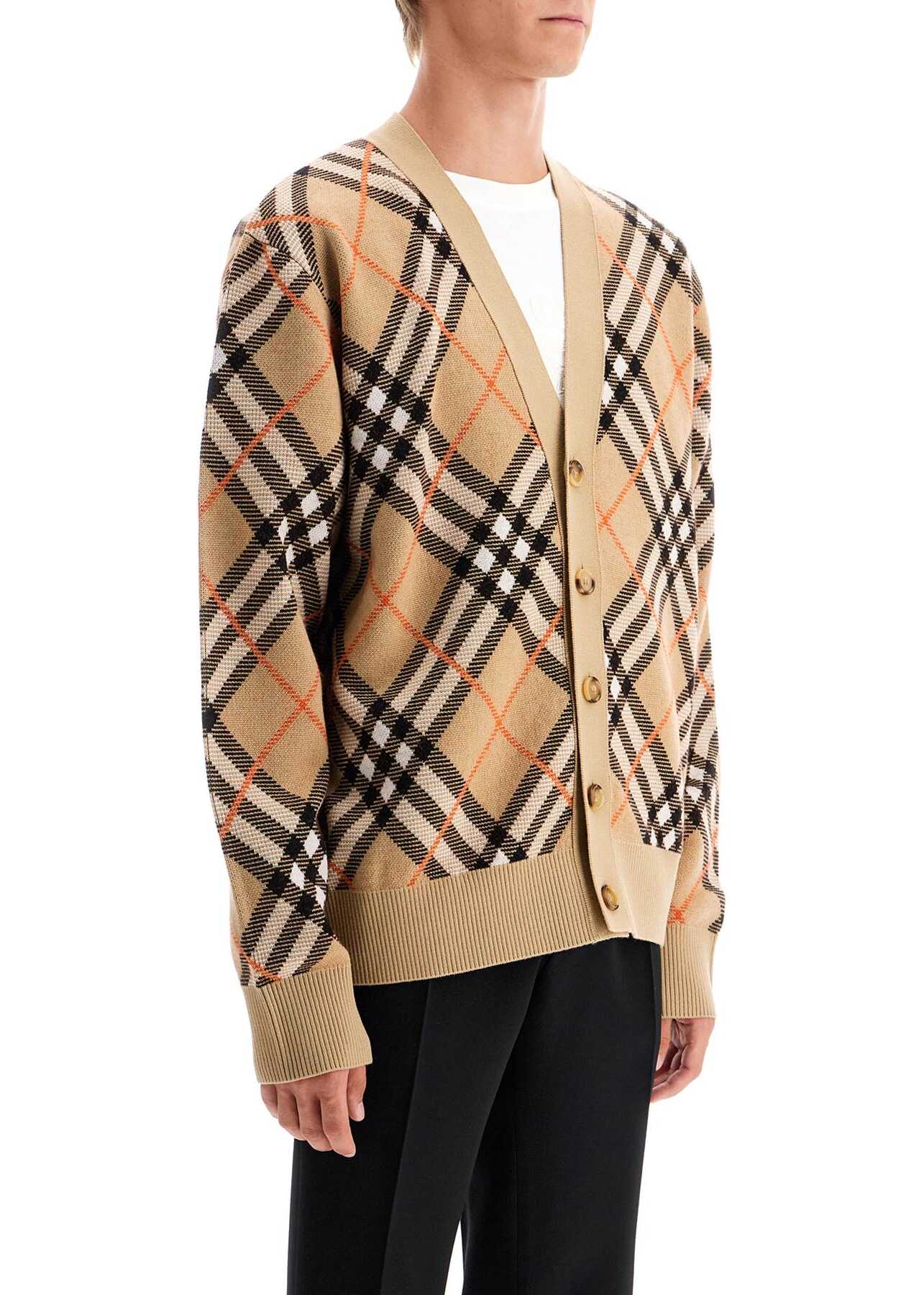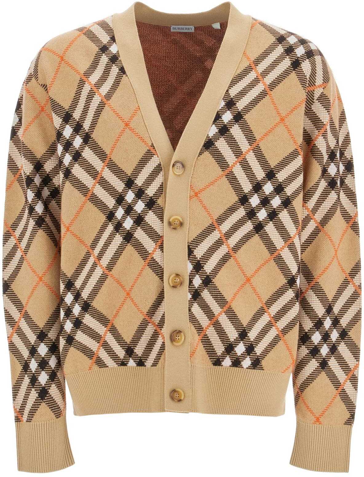 This cardigan is made of a blend of wool and mohair, featuring the iconic Burberry Check pattern in an all-over jacquard design. It has a classic V-neckline with button closure, finished with ribbed edges and a central split at the back. The fit is relaxed. The model is 187 cm tall and wears size L.