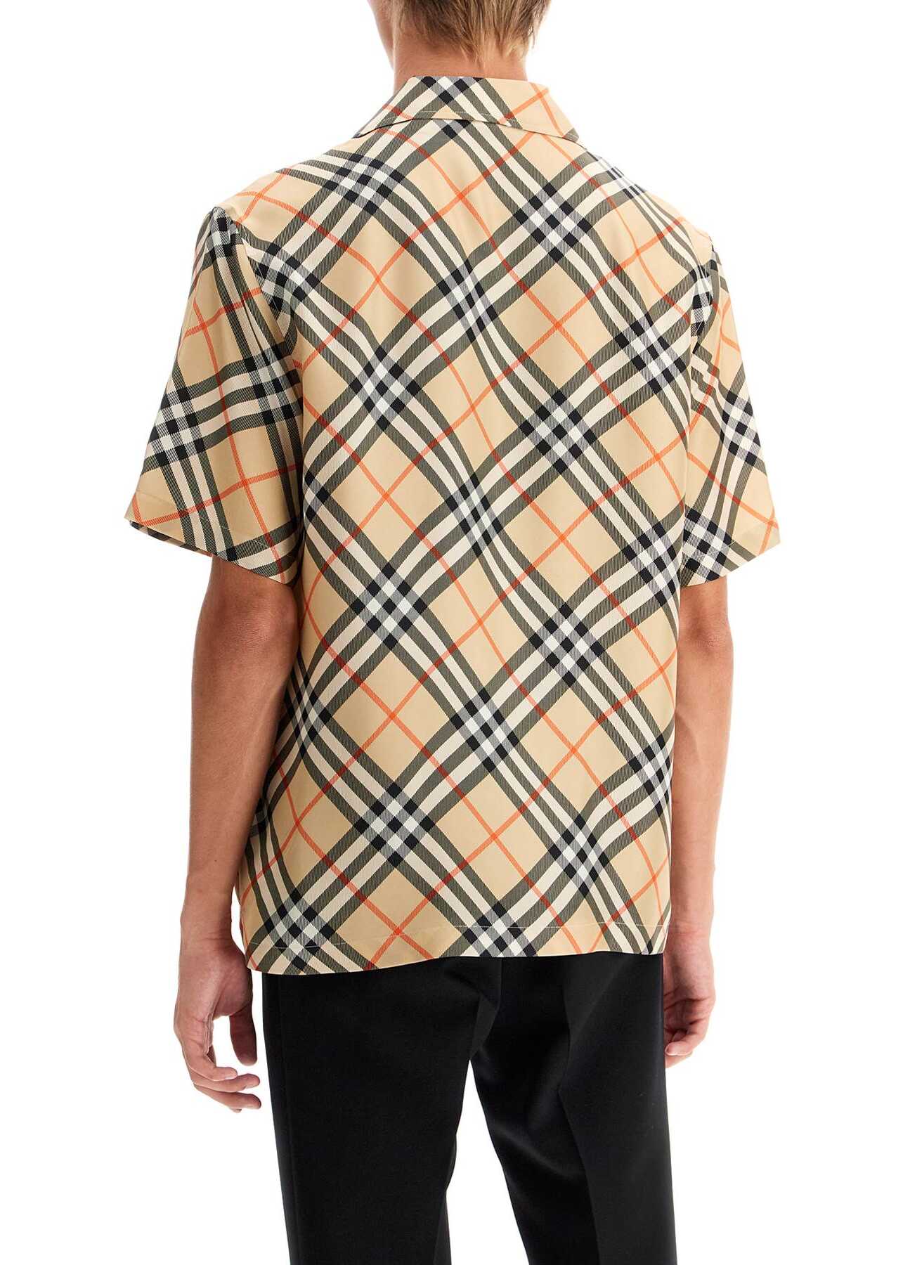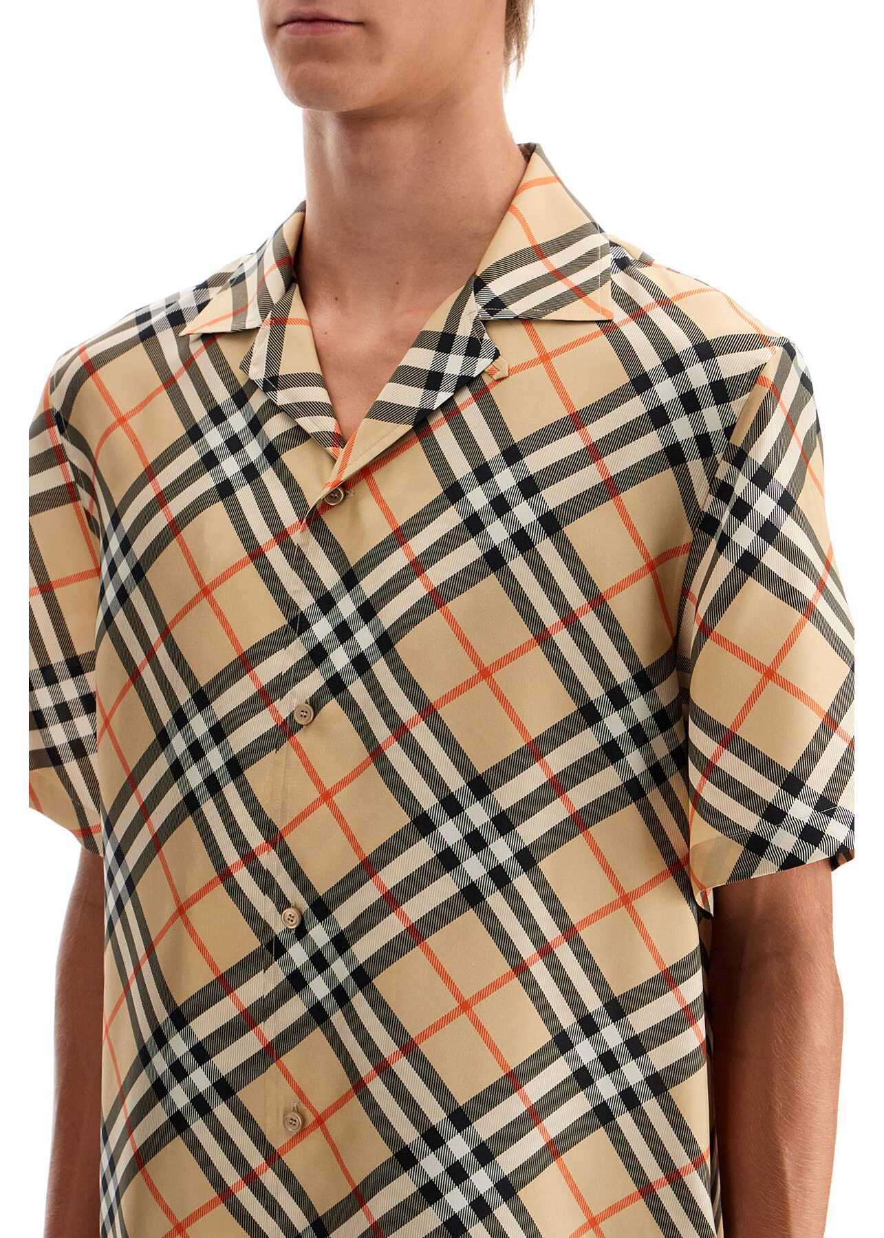 Short-sleeved shirt in pure silk with Burberry Check pattern all over. It features a boxy cut with a Cuban collar, French button placket and small side slits on the straight hem. The model is 187 cm tall and wears size L.