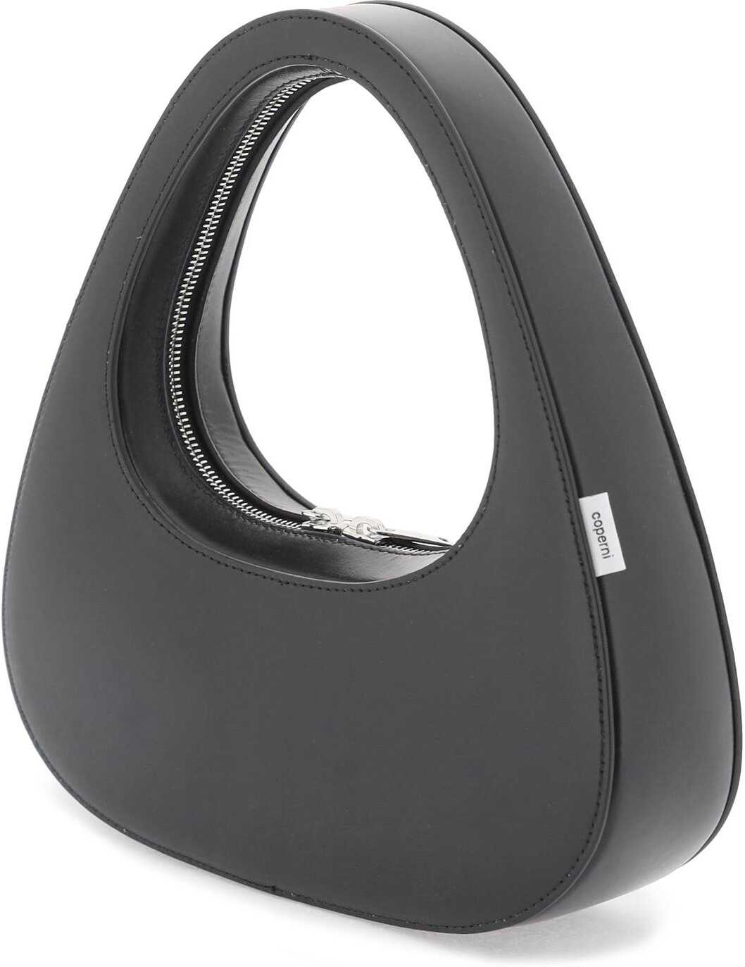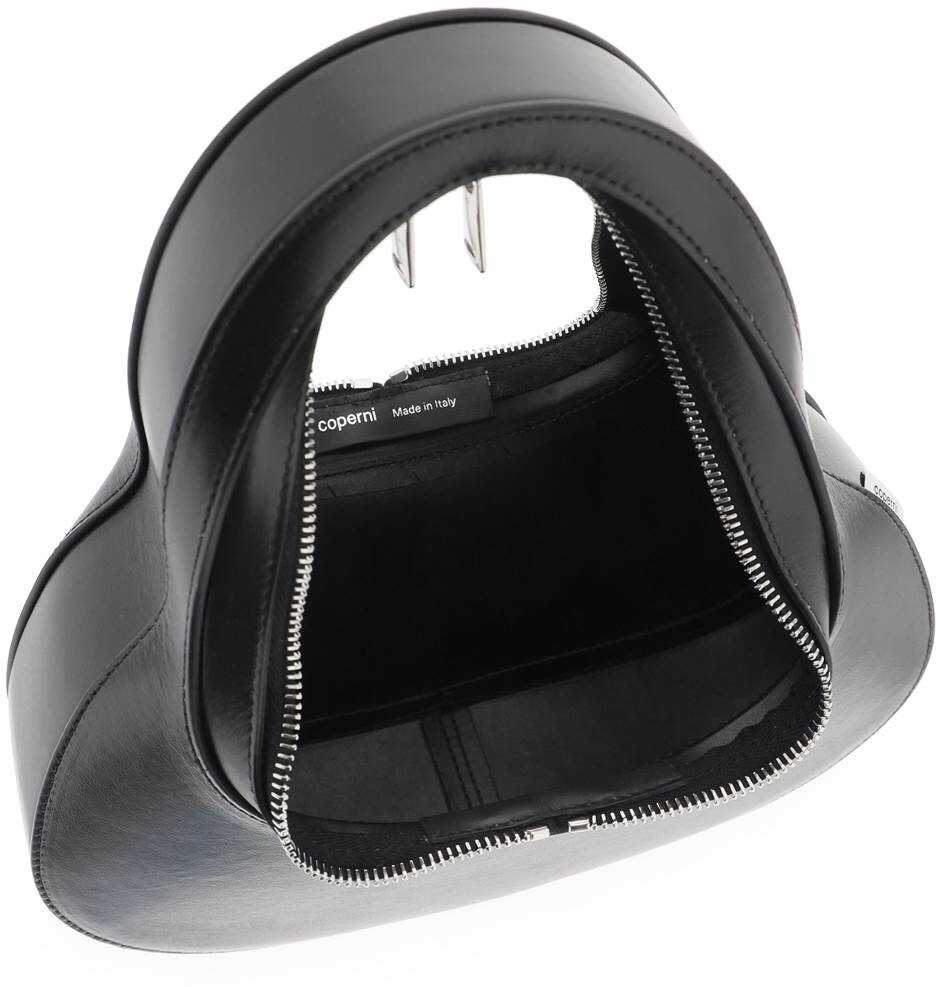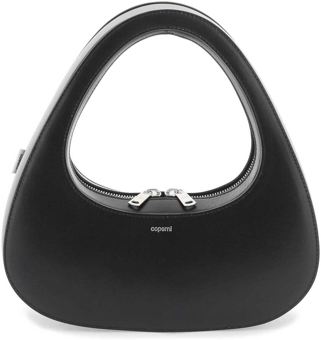 Coperni Swipe Baguette leather bag with rigid structure and zip around closure. Silver-tone logo print on front, side logo label, leather lining. Steel-tone hardware.