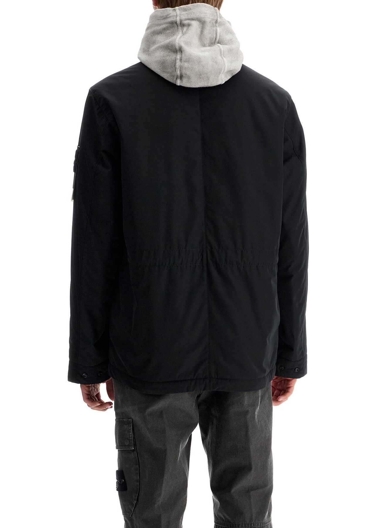 This Stone Island jacket is made of Micro Twill fabric with water-repellent properties, padded with a layer of 100% recycled PRIMALOFT Gold P.U.R.E fibers. It features a two-way zip and snap button closure, a standing collar with a detachable hood, four front pockets with flaps, and an inner pocket. The fit is regular with an adjustable drawstring at the waist. The model is 187 cm tall and wears size L.