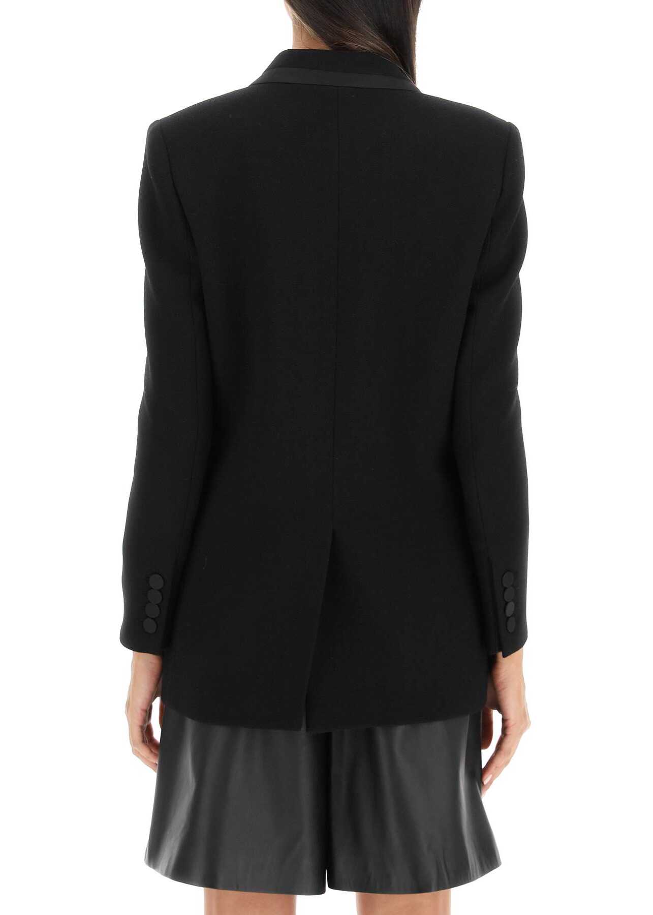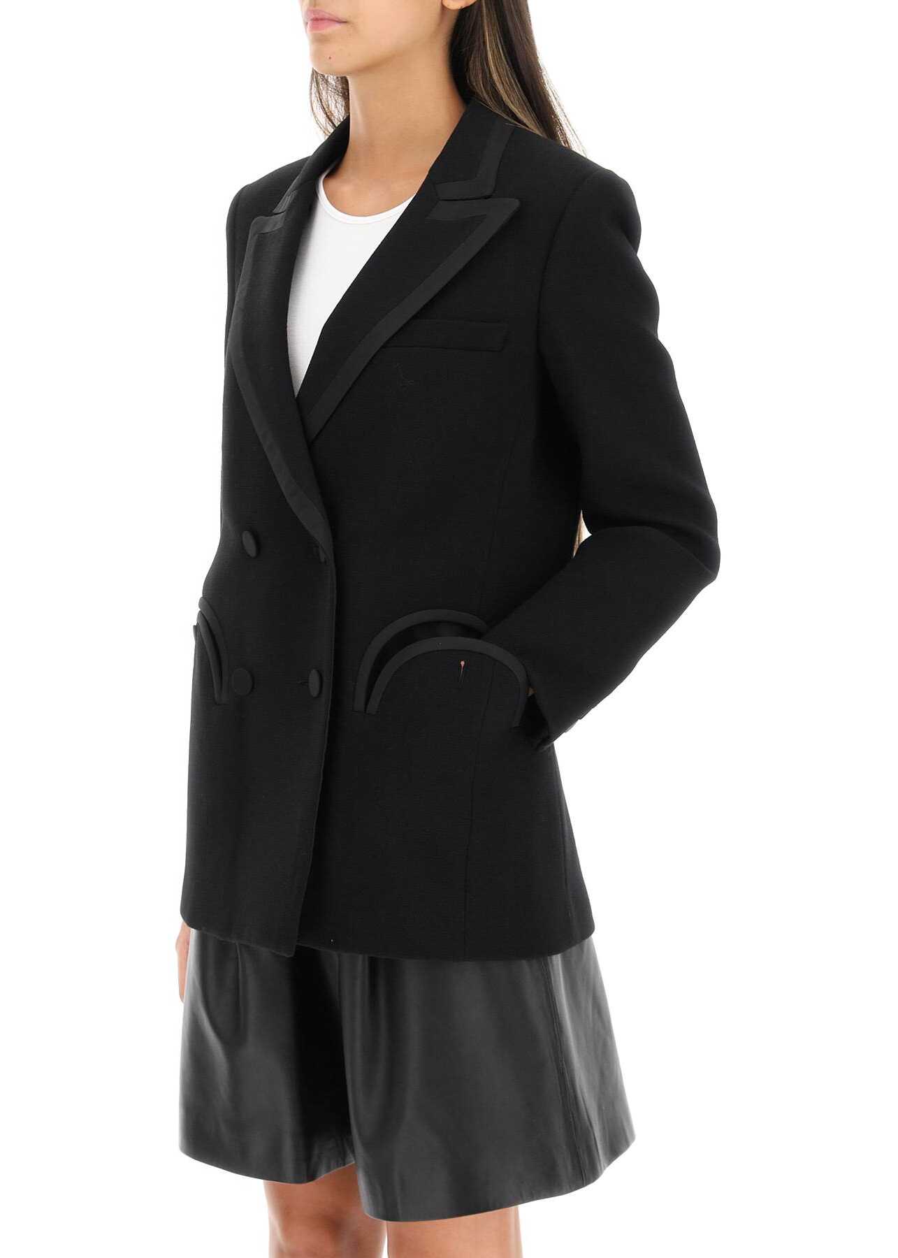 Blazé Milano wool crepe blazer with satin details and covered button closure. It features padded shoulders, peak lapels, smiley pockets, chest pocket, central back vent, four-button cuffs. Cupro blend lining, four inside pockets. Model height is 177 cm and she is wearing a size 0.