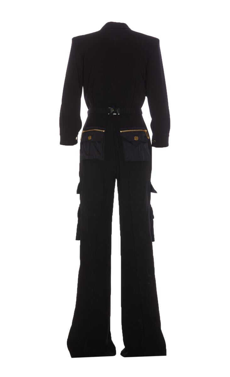 Elisabetta Franchi black suit with zip closure, belt closure on waist with plaque logo, zip pockets, logo button closure, long sleeves, regular collar, reinforced shoulder, EU SIZE (IT)