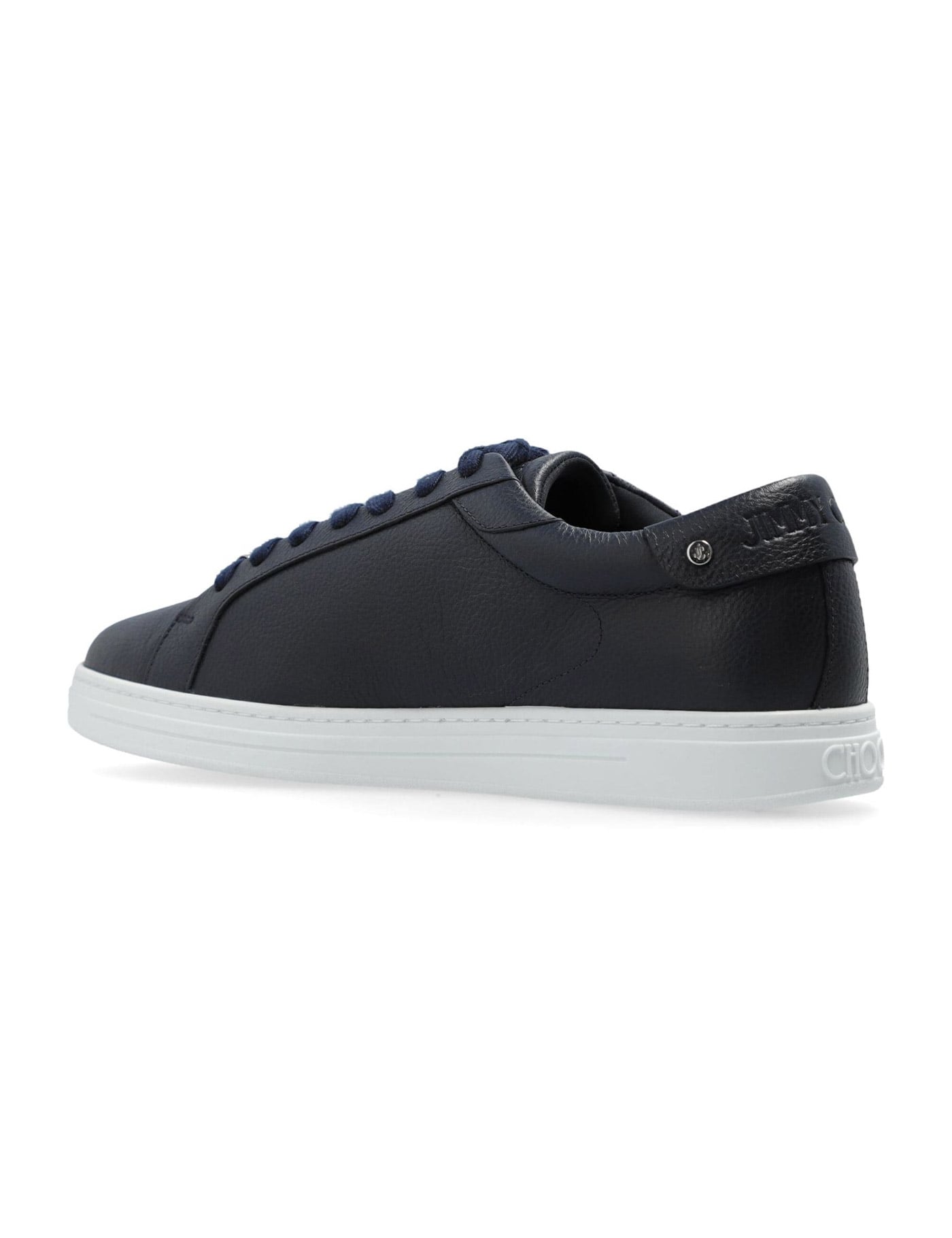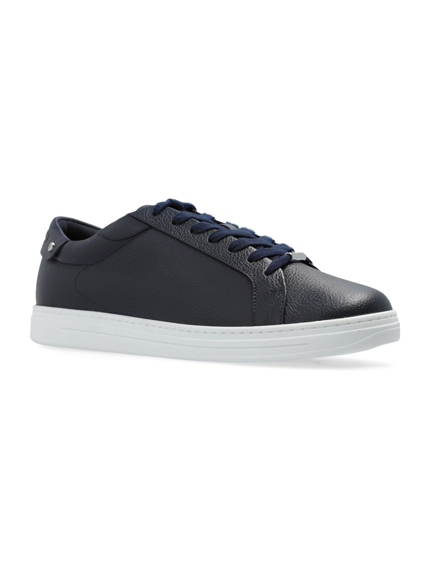 The Jimmy Choo Rome sneakers are made of hammered leather, with a minimal design detailed by a metal element on the laces. The logo is printed on the tongue and on the spoiler, which is finished with two engraved metal rivets. The interior is lined with fabric and has a removable branded insole, while the rubber sole features a large logo lettering imprint on the bottom.