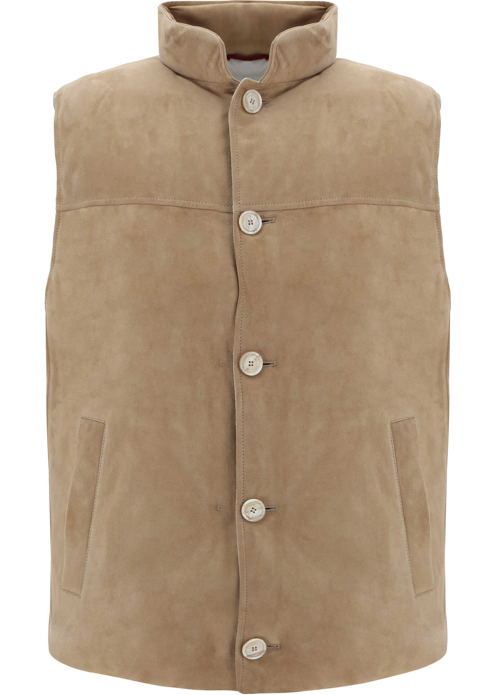 Padded Vest by Brunello Cucinelli, front closure by contrasting buttons, design made of suede, two side slit pockets, padded and lined design.