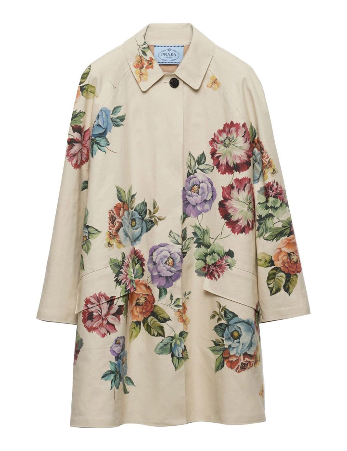Cotton Coat by Prada, classic collar, button front closure, two welt flap pockets on front, back slit, all-over multicolored floral print, regular fit.