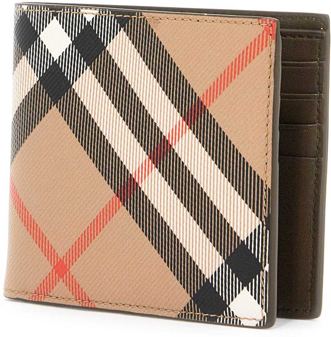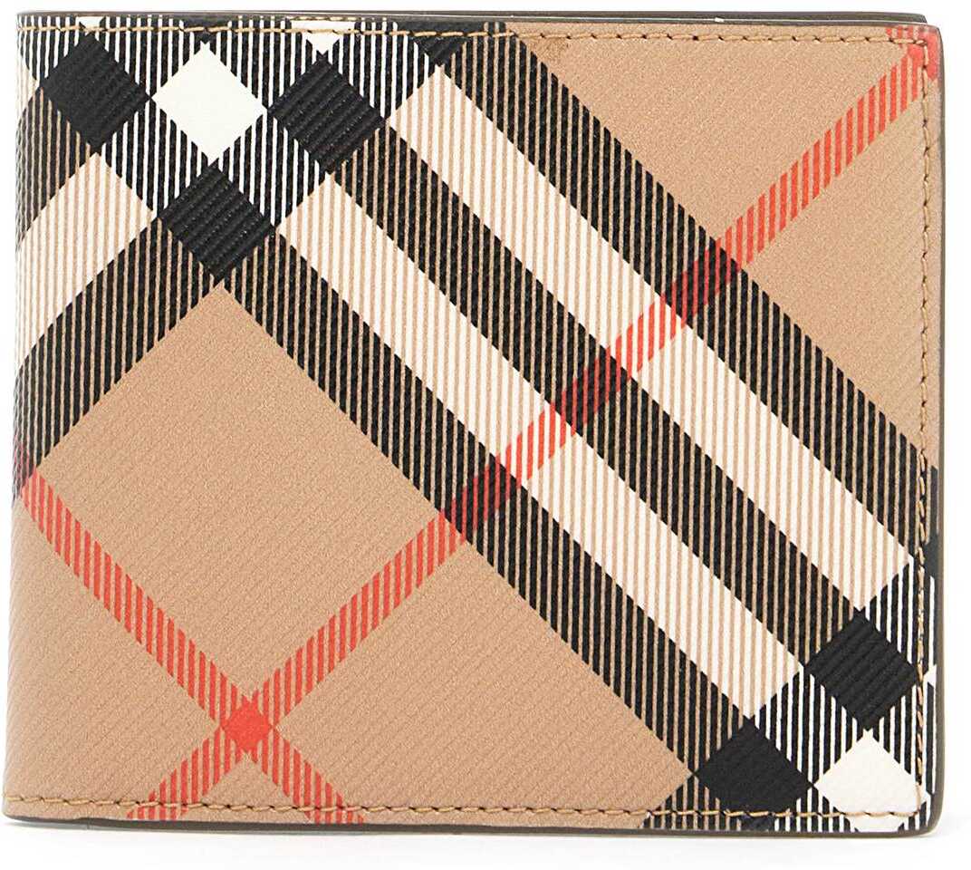 This Burberry bi-fold wallet is made of coated canvas with the iconic Check pattern and features two compartments for bills, eight credit card slots, and two slip pockets.