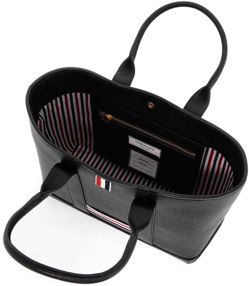 The Small Tool tote bag by Thom Browne is made of pebble grain leather with a tricolor ribbon insert on the front and back, as well as an iconic grosgrain tab on the front. Its minimal design features double handles with reinforced inserts, a snap button closure, and a tricolor fabric lining with a zip pocket inside.