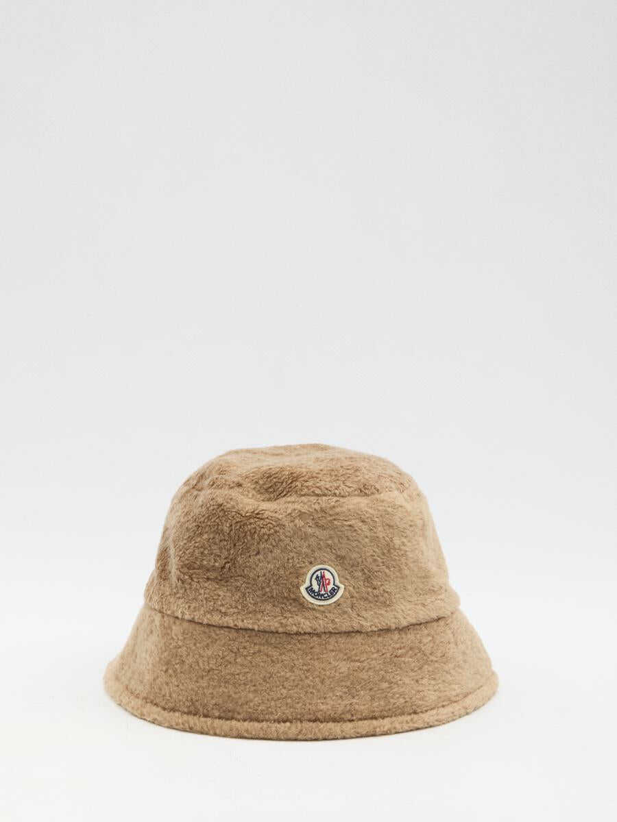 Reversible bucket hat in beige nylon and cotton blend on one side and beige teddy fabric on the other one. Moncler patch on the front.