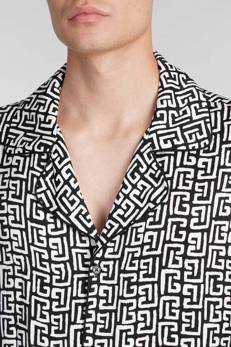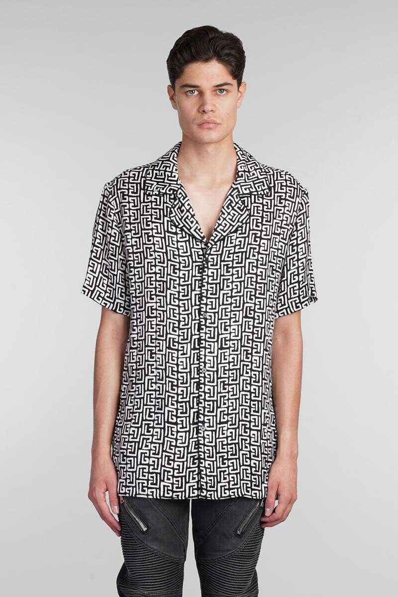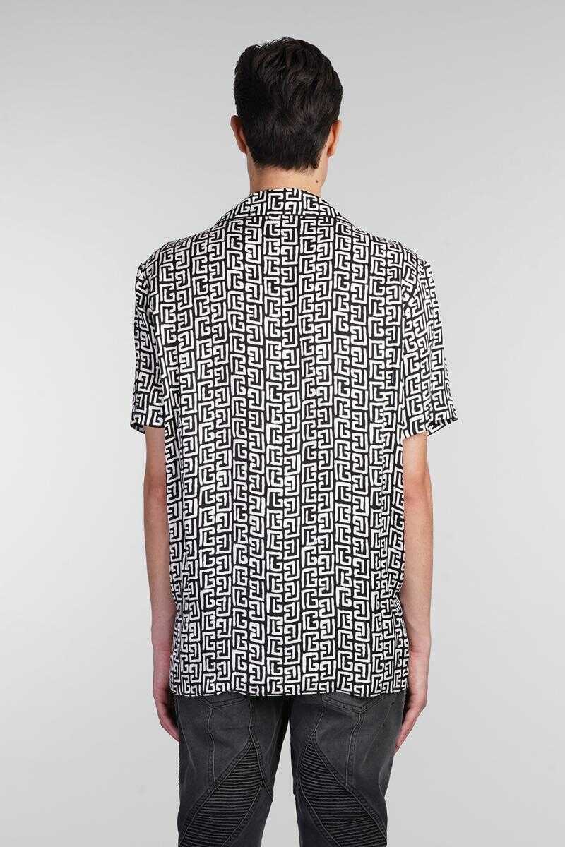 Shirt in black polyamide polyester, bowling neck, short sleeves, frontal buttoning, logo all over, 100% cupro, Made in Bulgaria