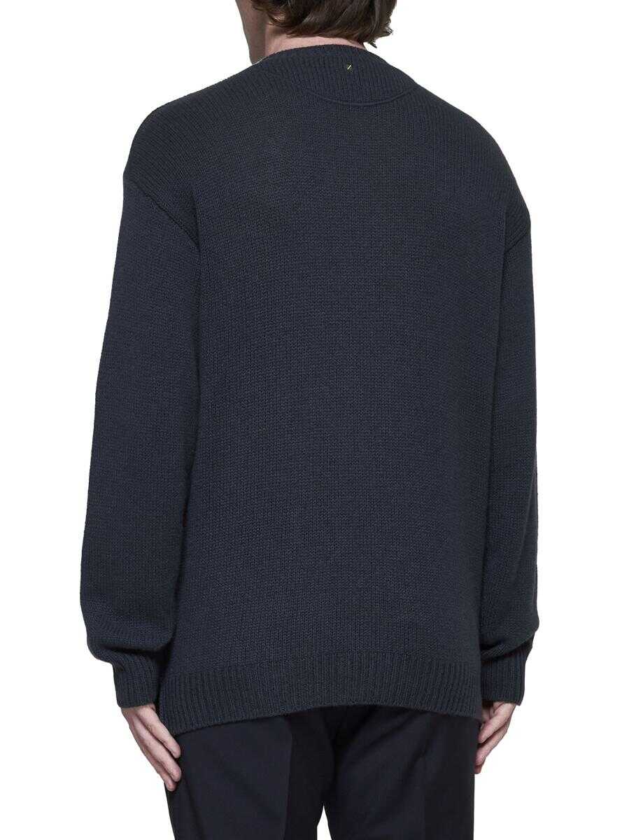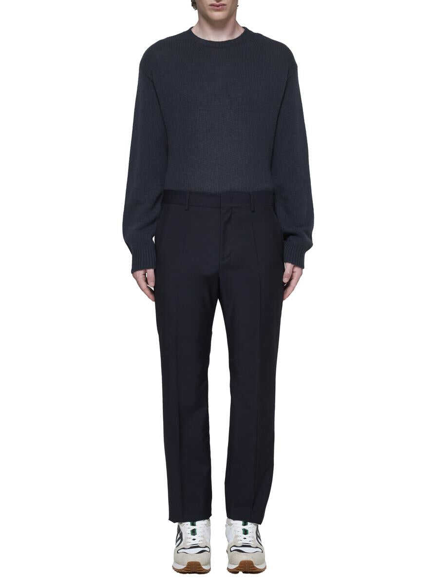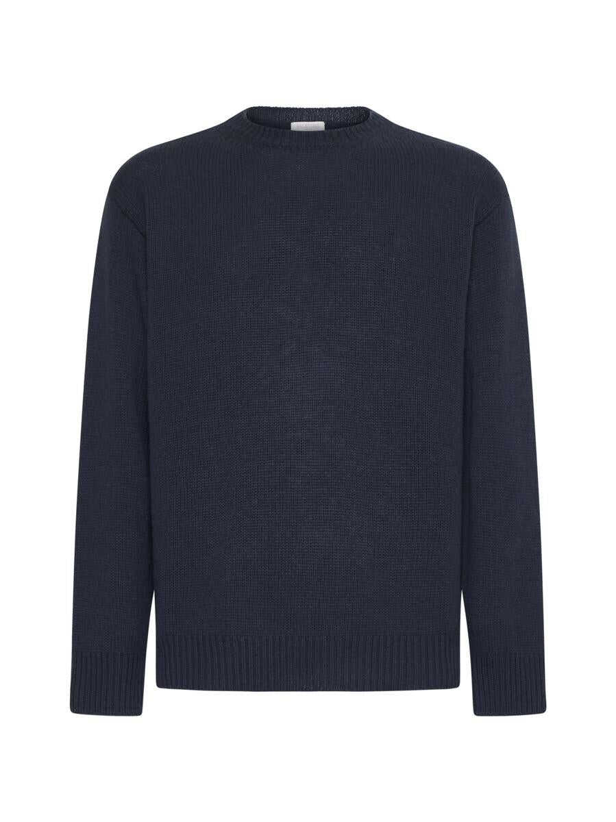 Valentino’s charcoal grey cashmere sweater featuring a crew neck, ribbed edges and iconic stud on the back. The model is wearings shoes from Valentino Garavani.