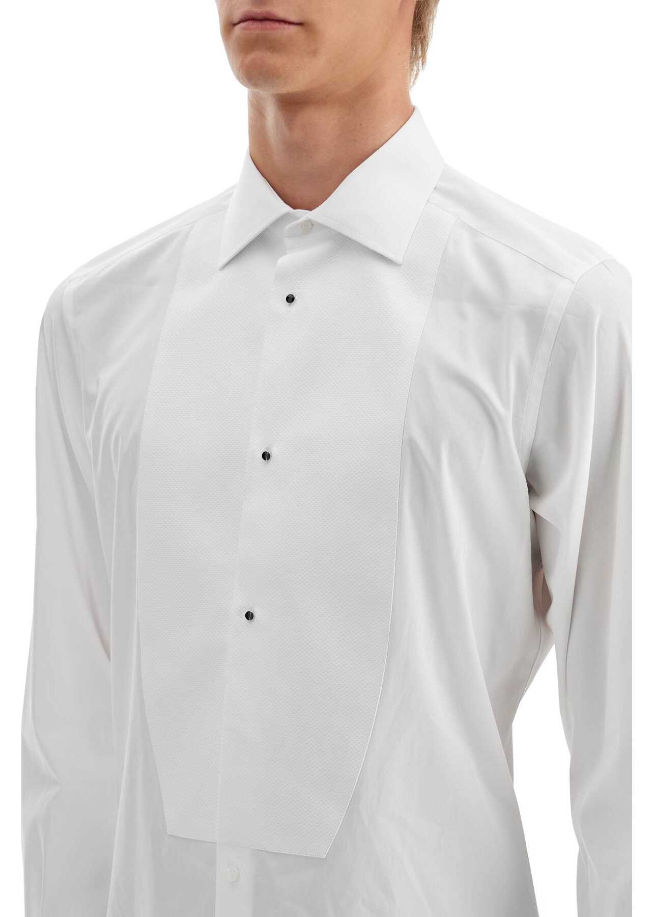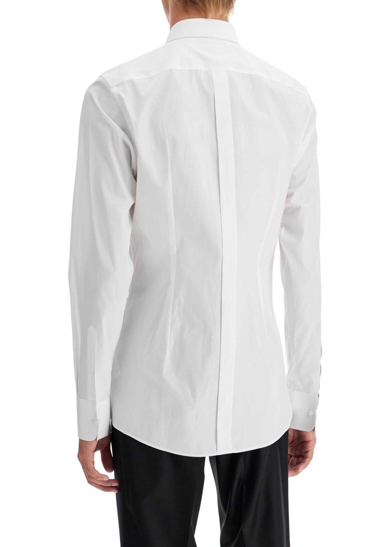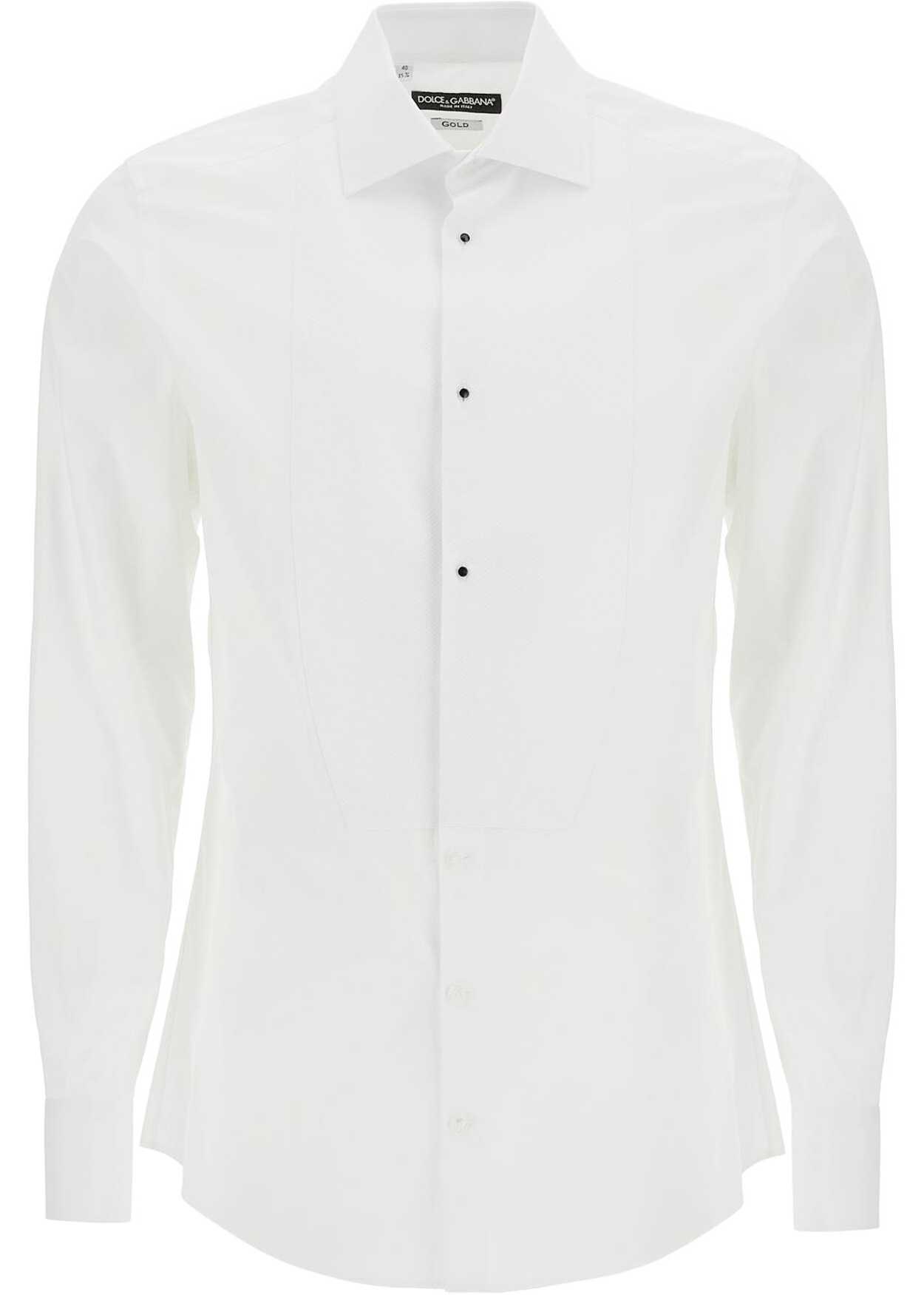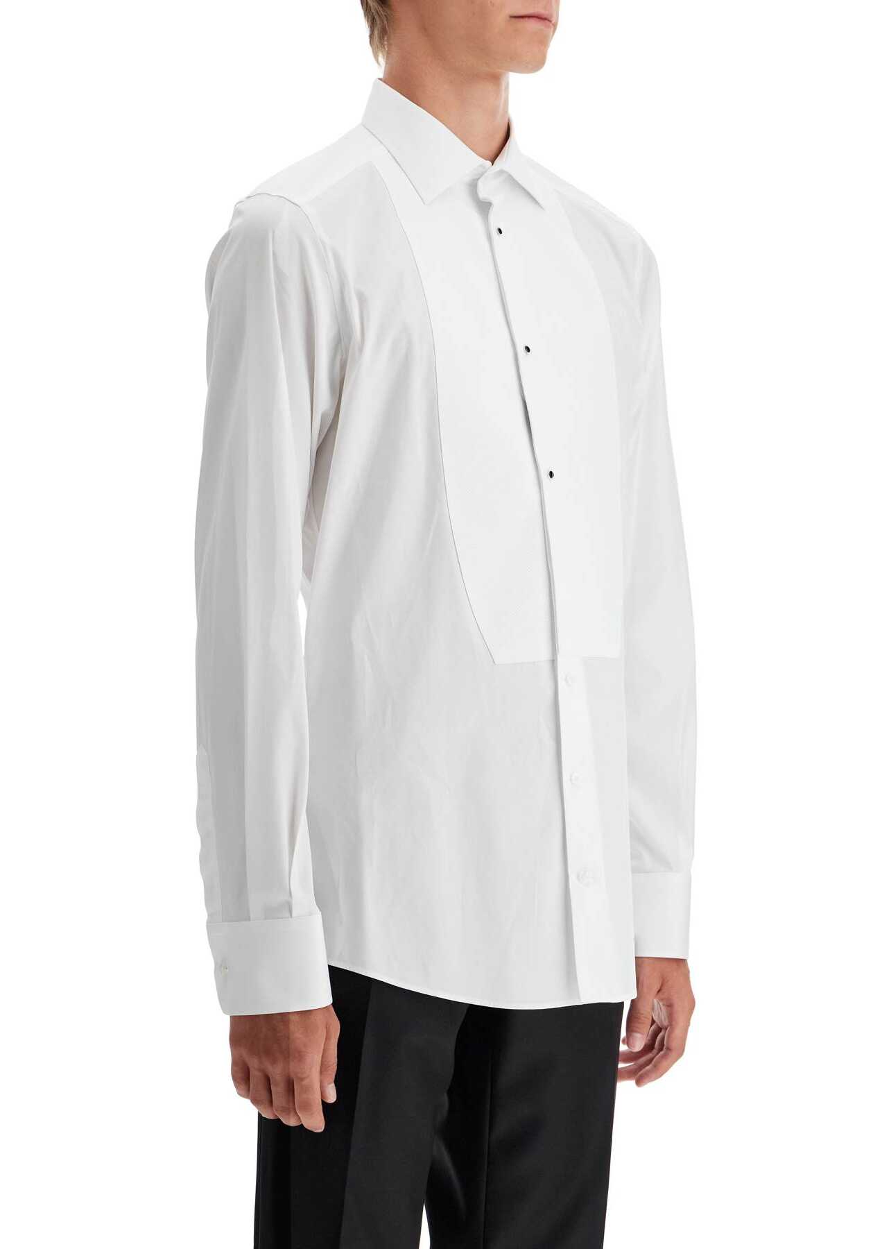 This Dolce & Gabbana tuxedo shirt is made of cotton poplin with a piqué plastron. It features a French collar and cufflinks, and has a slim fit with darts and a pleat on the back. The front buttoning includes three small enameled black buttons. The model is 187 cm tall and wears size 40.