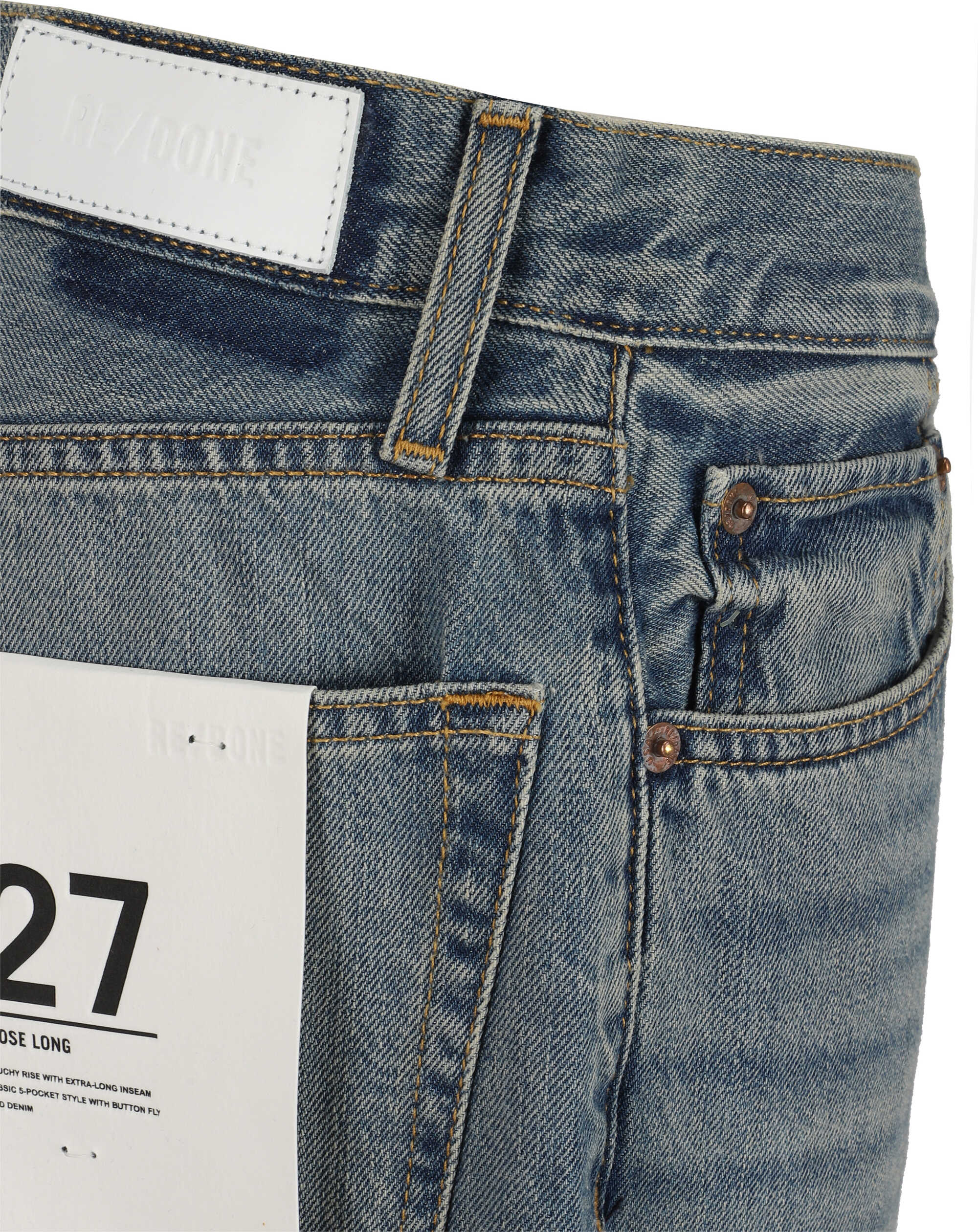 Cotton Jeans by Re/Done, five-pocket style, front button closure, front button closure, waistband loops, iconic branded signature leather pressure-printed patch applied at back.