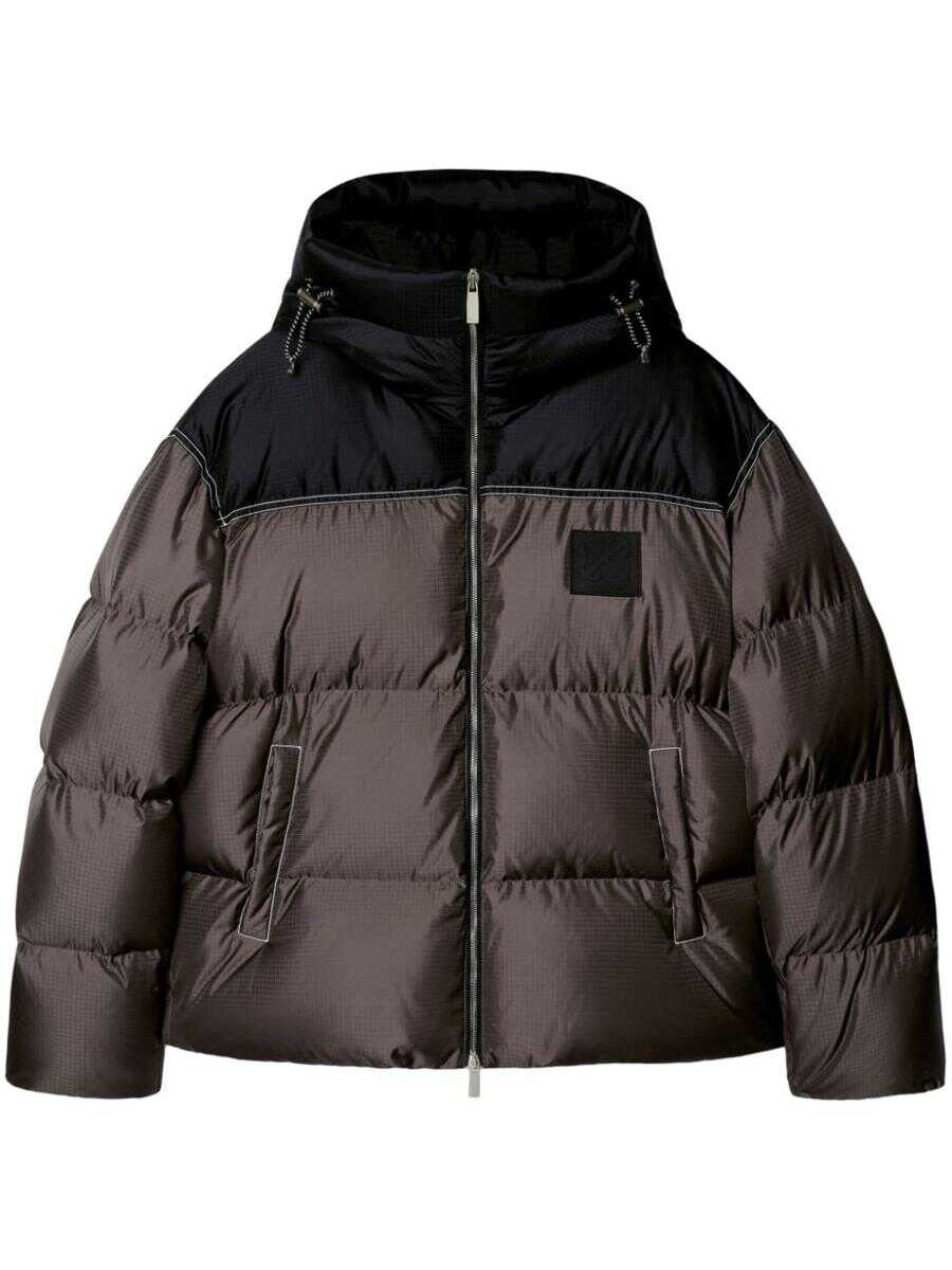 - Off-White - Technical fabric down jacket - Black and grey - Adjustable drawstring hood - Two side pockets - Front zip closure - Front applied logo - Drawstring hem - Men's