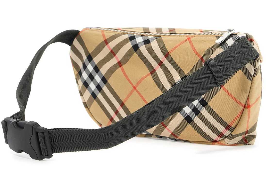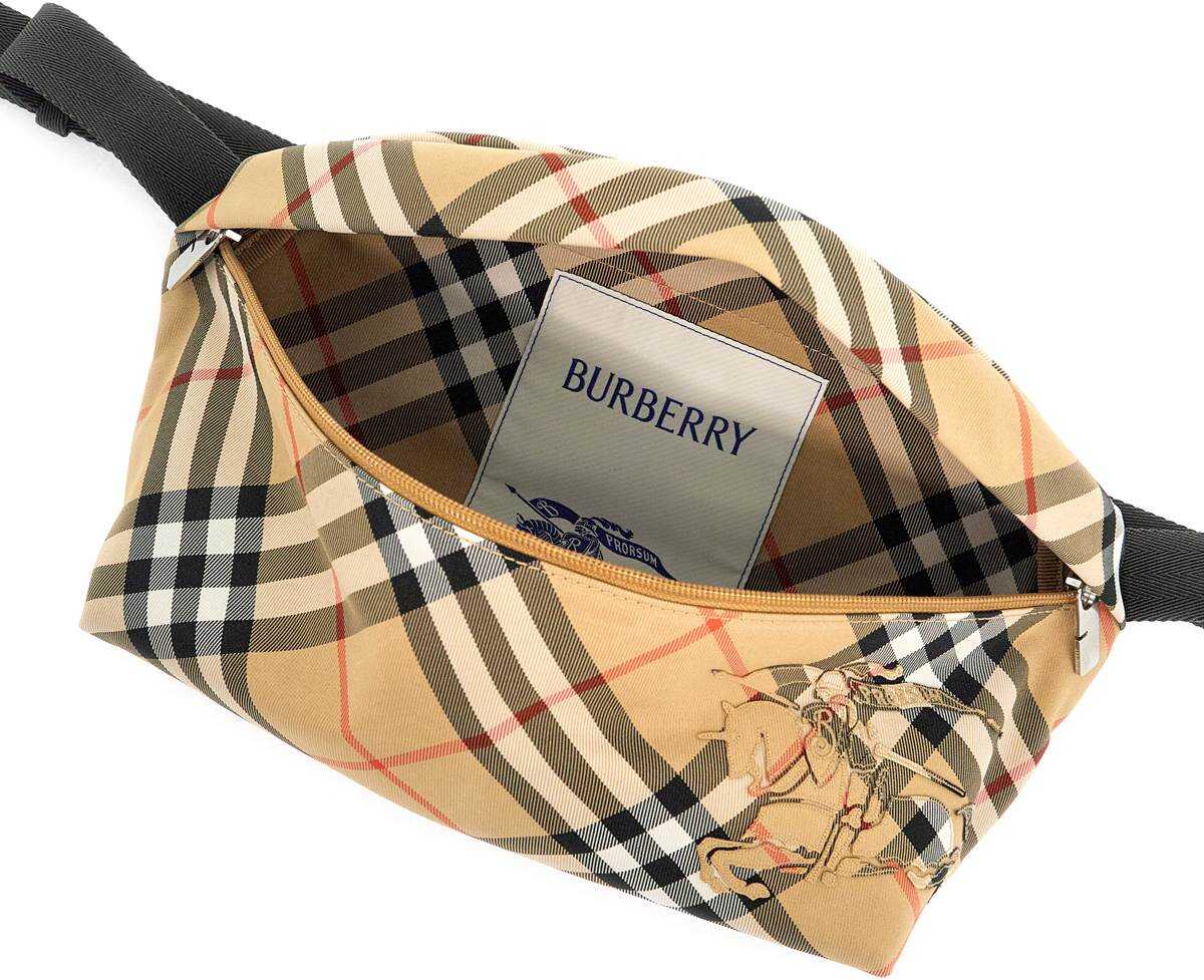 The Burberry Marsupio is made of technical fabric with the iconic Burberry Check pattern and adorned with an Equestrian Knight Design appliqué. It features a two-way zip closure, a lined interior, and an additional back pocket. The adjustable strap is made of ribbon and the metallic accessories have a silver finish.