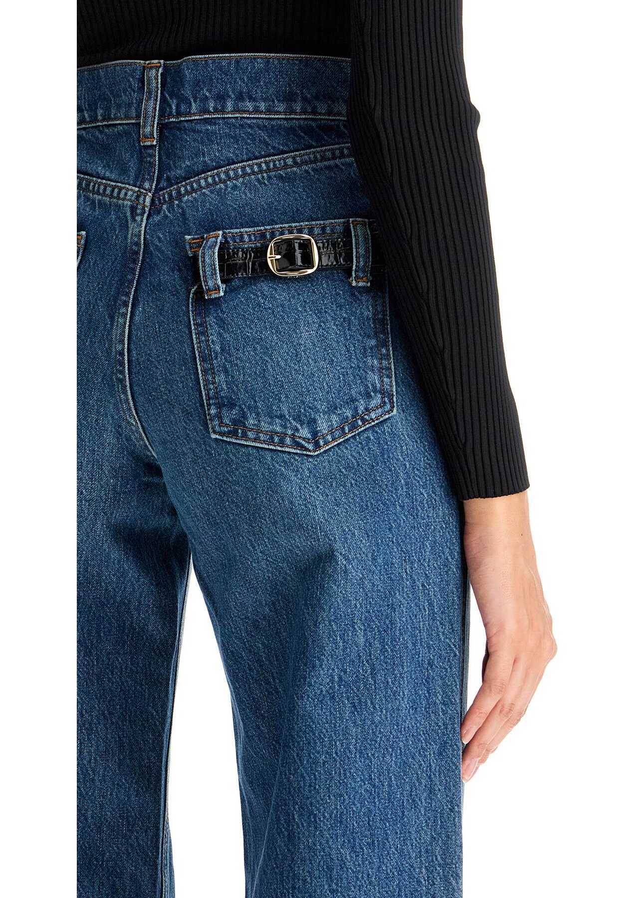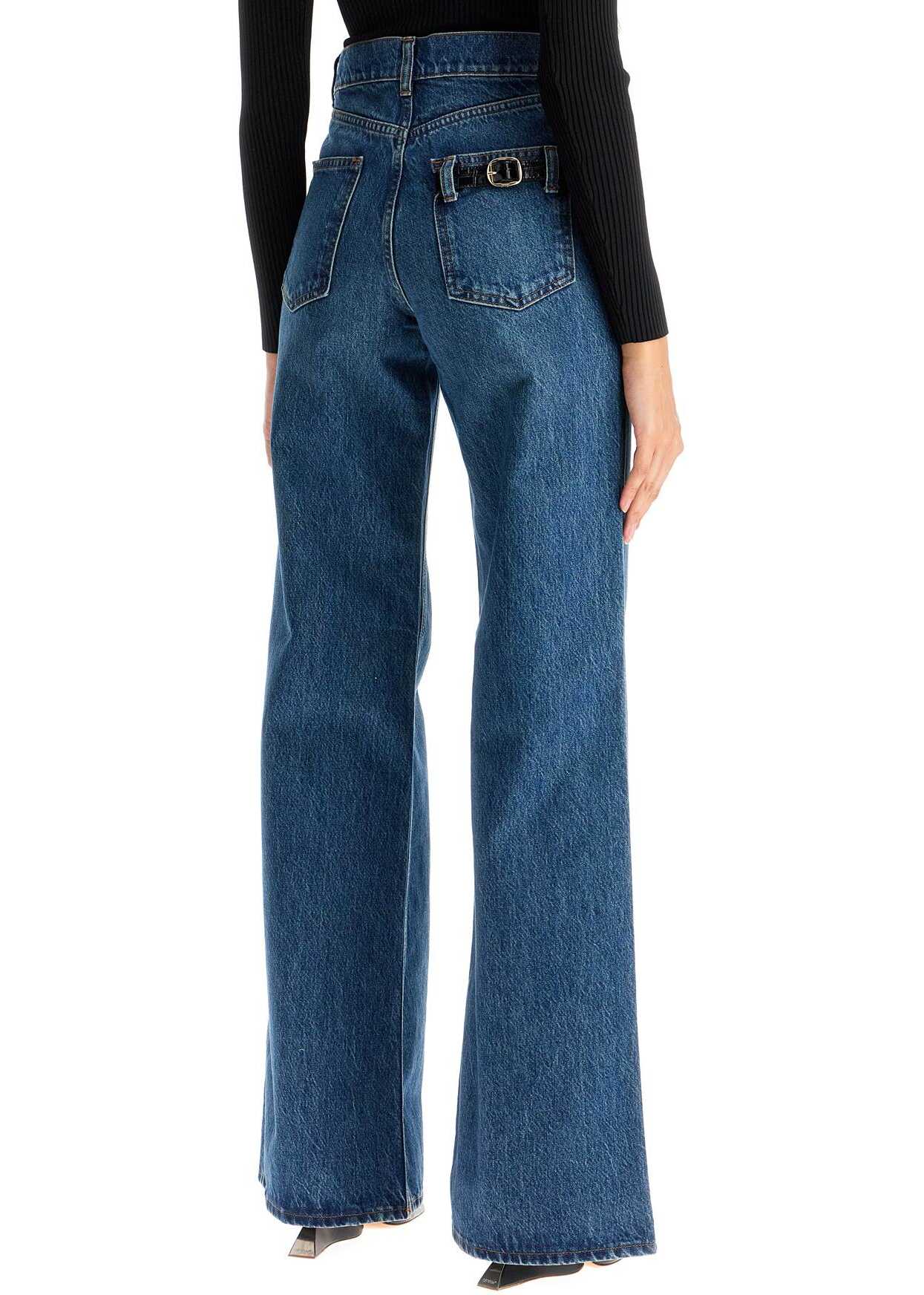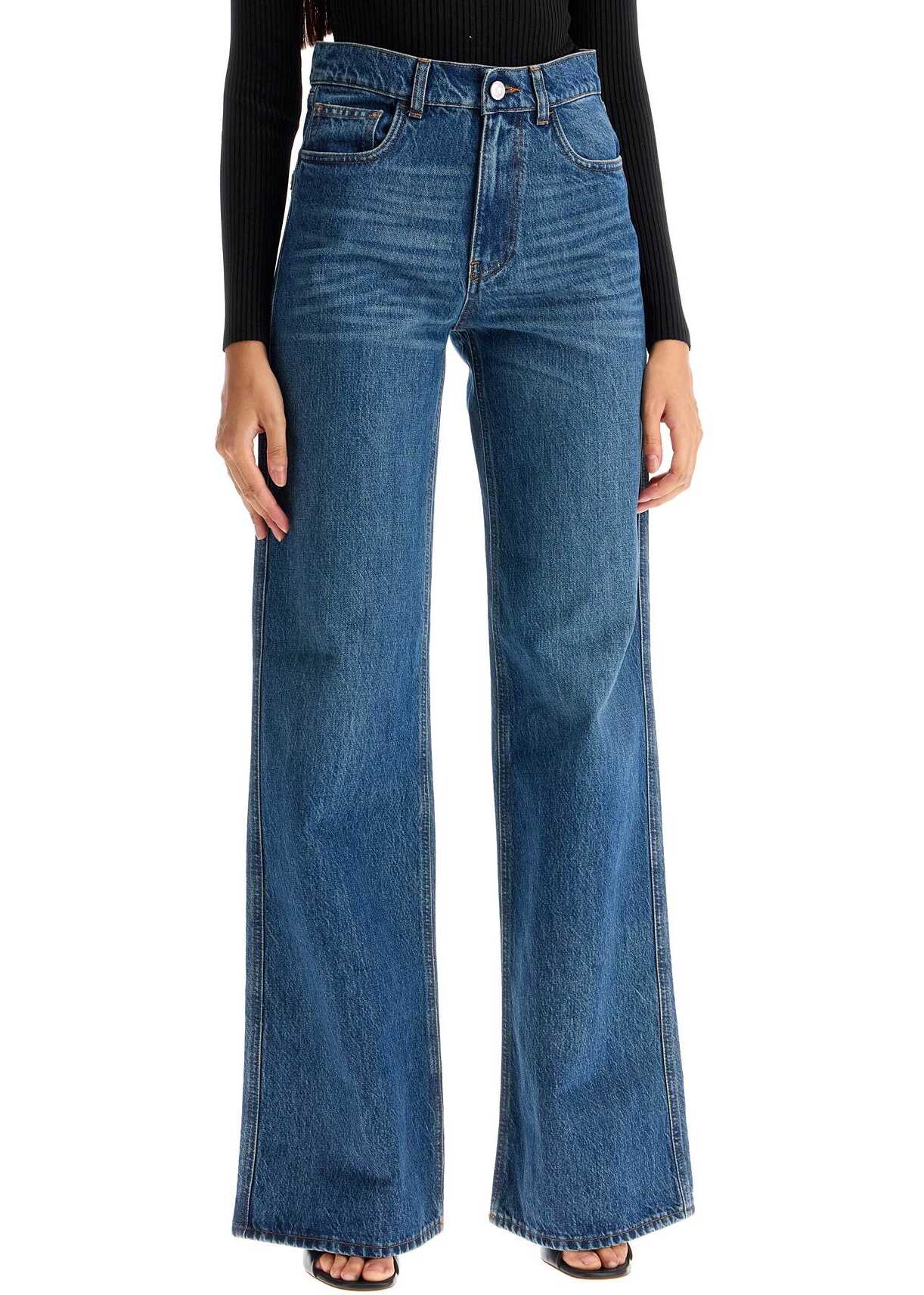 High-waisted Coperni jeans in vintage wash denim, featuring a wide leg silhouette. The classic five-pocket construction is completed with a zip and button closure, belt loops, and a belt attached to the back pocket. The model is 177 cm tall and wears a size XS.