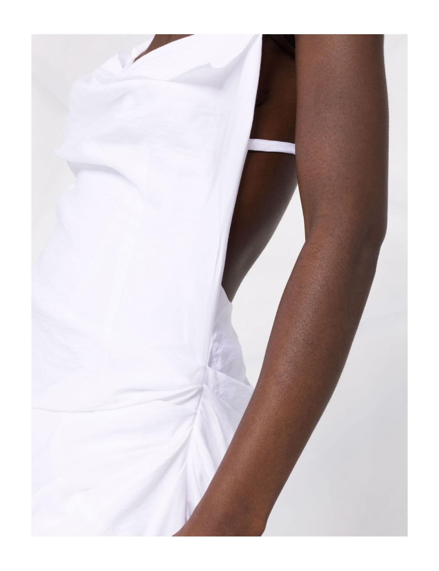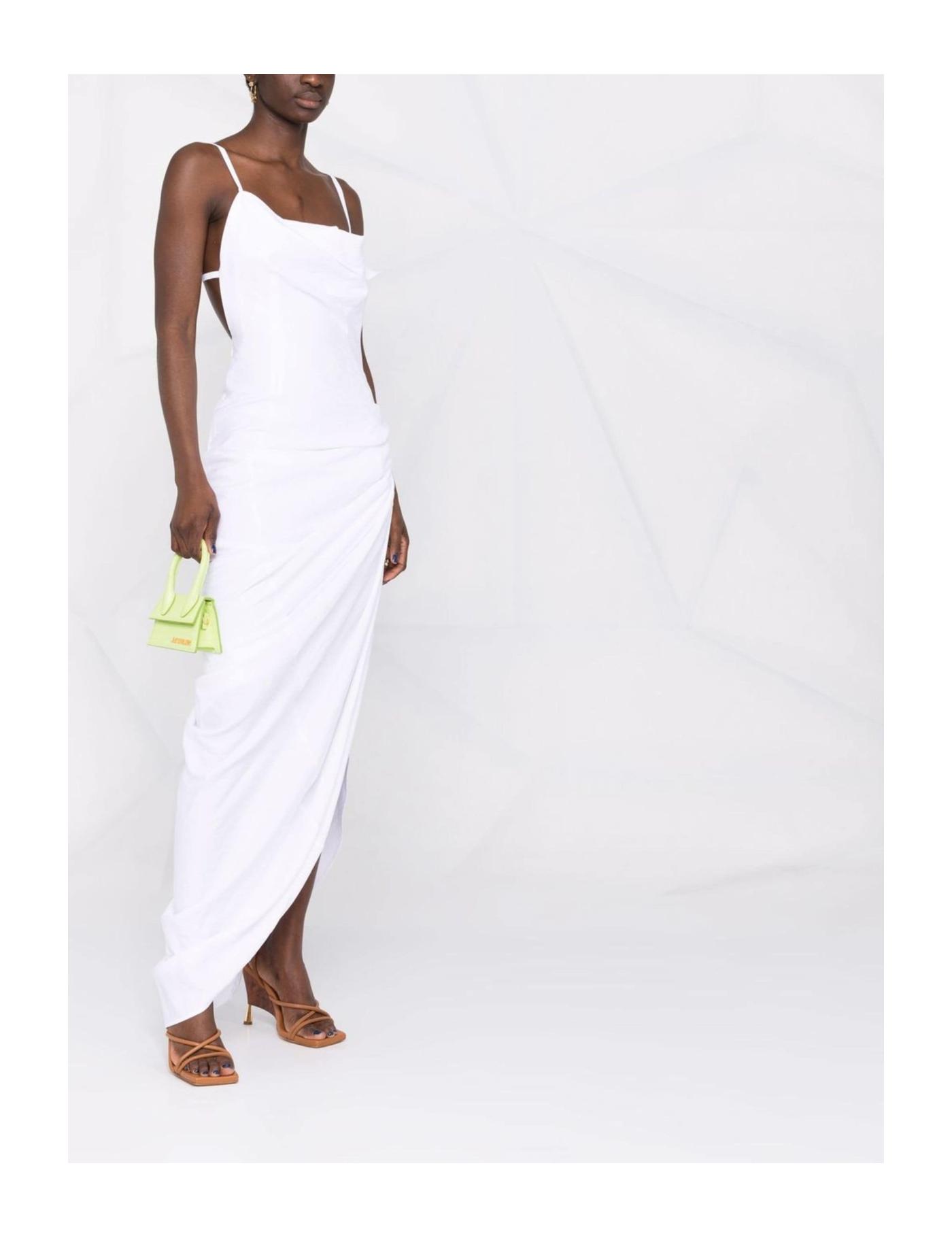 With an all-white hue, the Saudade dress can be found in Jacquemus' SS22 collection. The draped design and asymmetric hem reflect the brand's innovative approach to fashion.