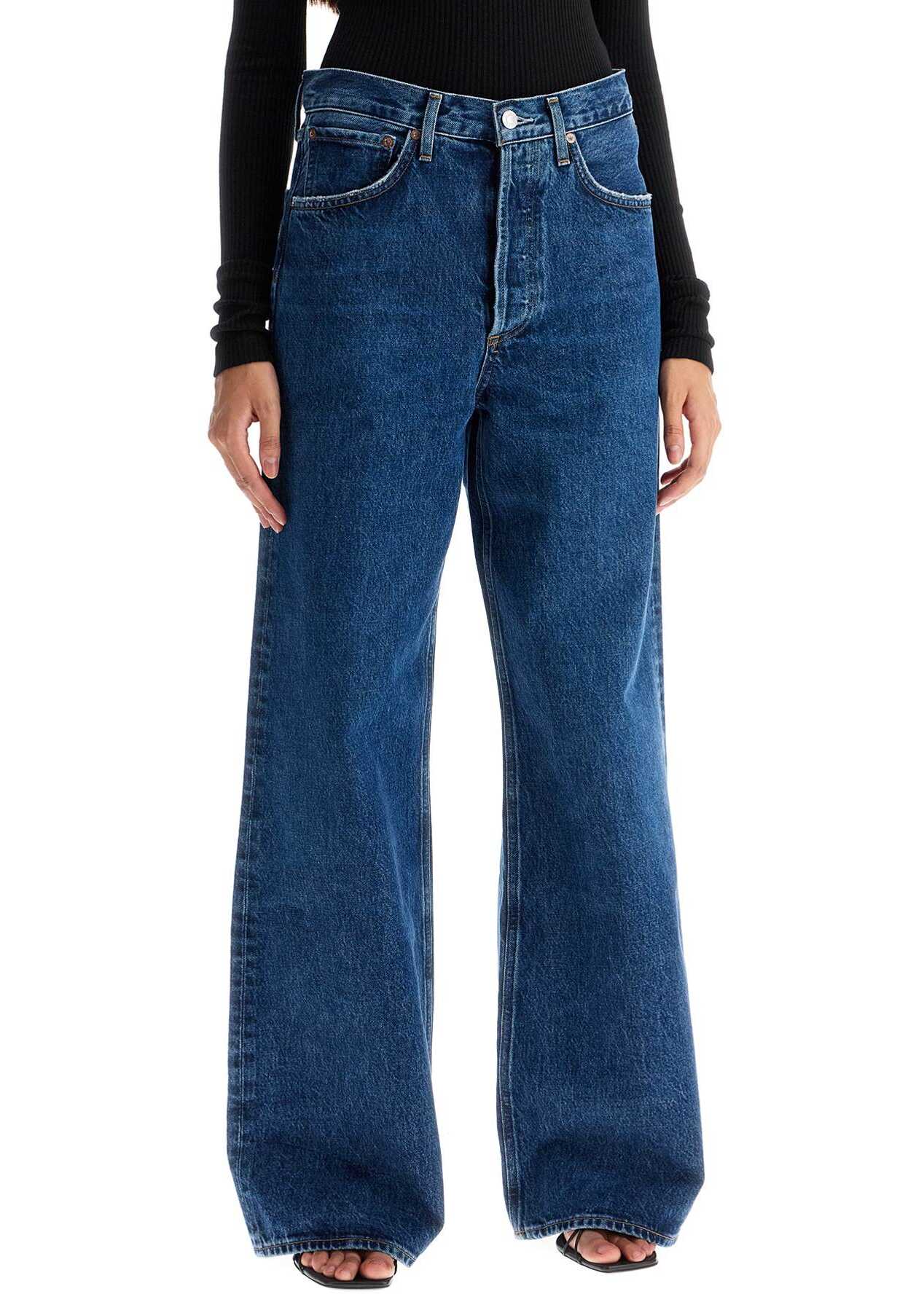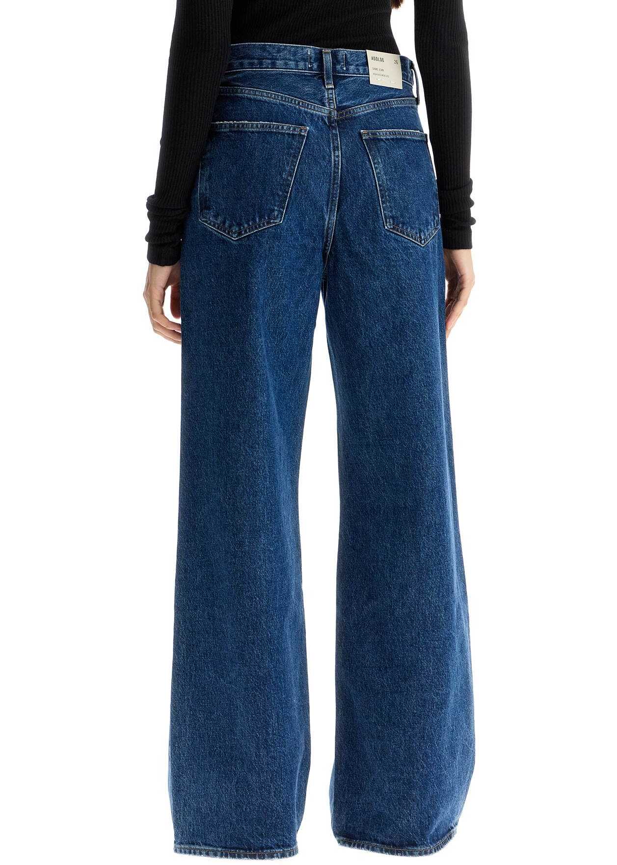 Agolde jeans crafted in dark-washed regenerative cotton denim with five-pocket design. They feature front fastening with button fly, belt loops and distressed detailing. Wide leg. The model is 177 cm tall and wears size 26.