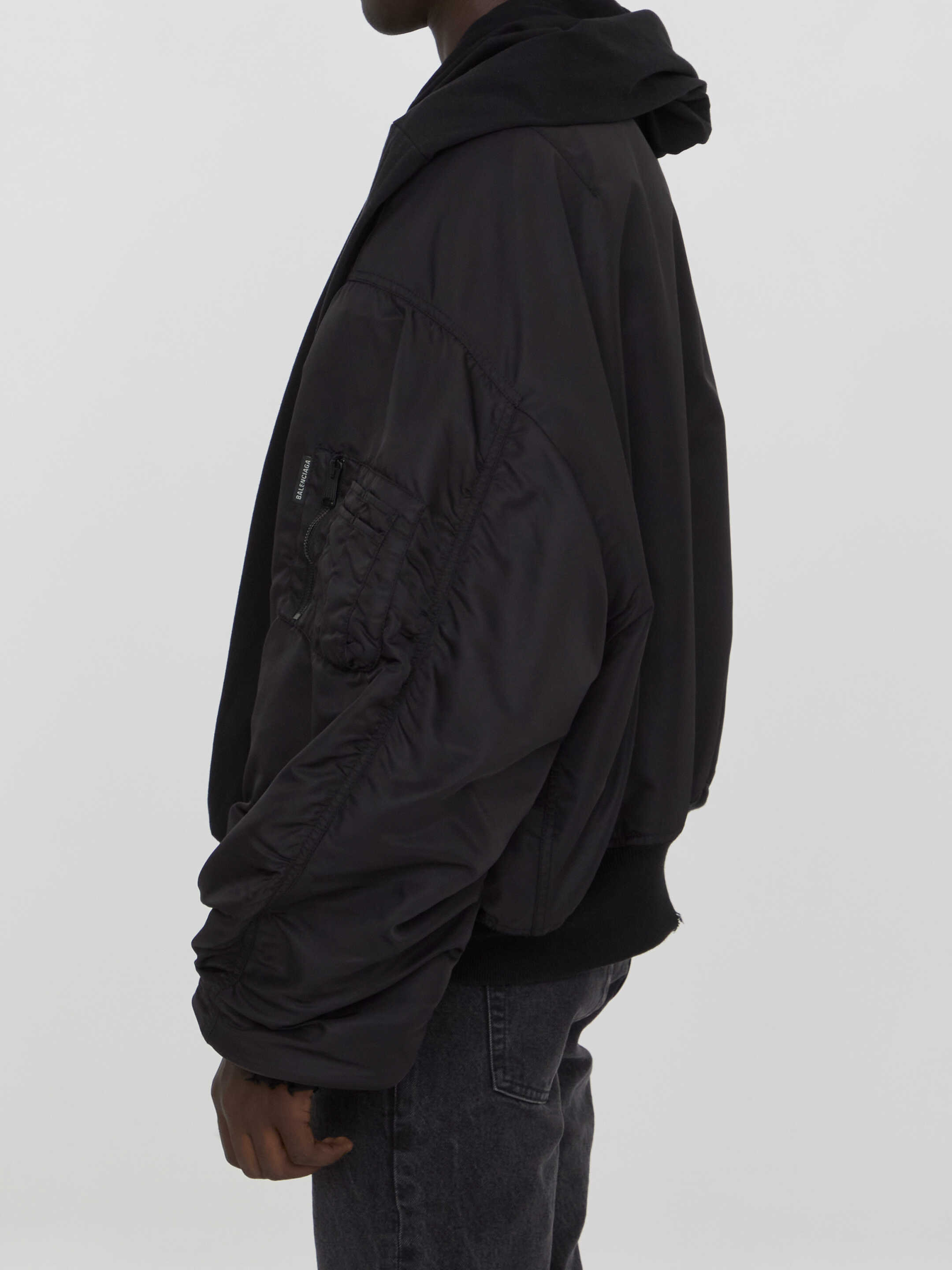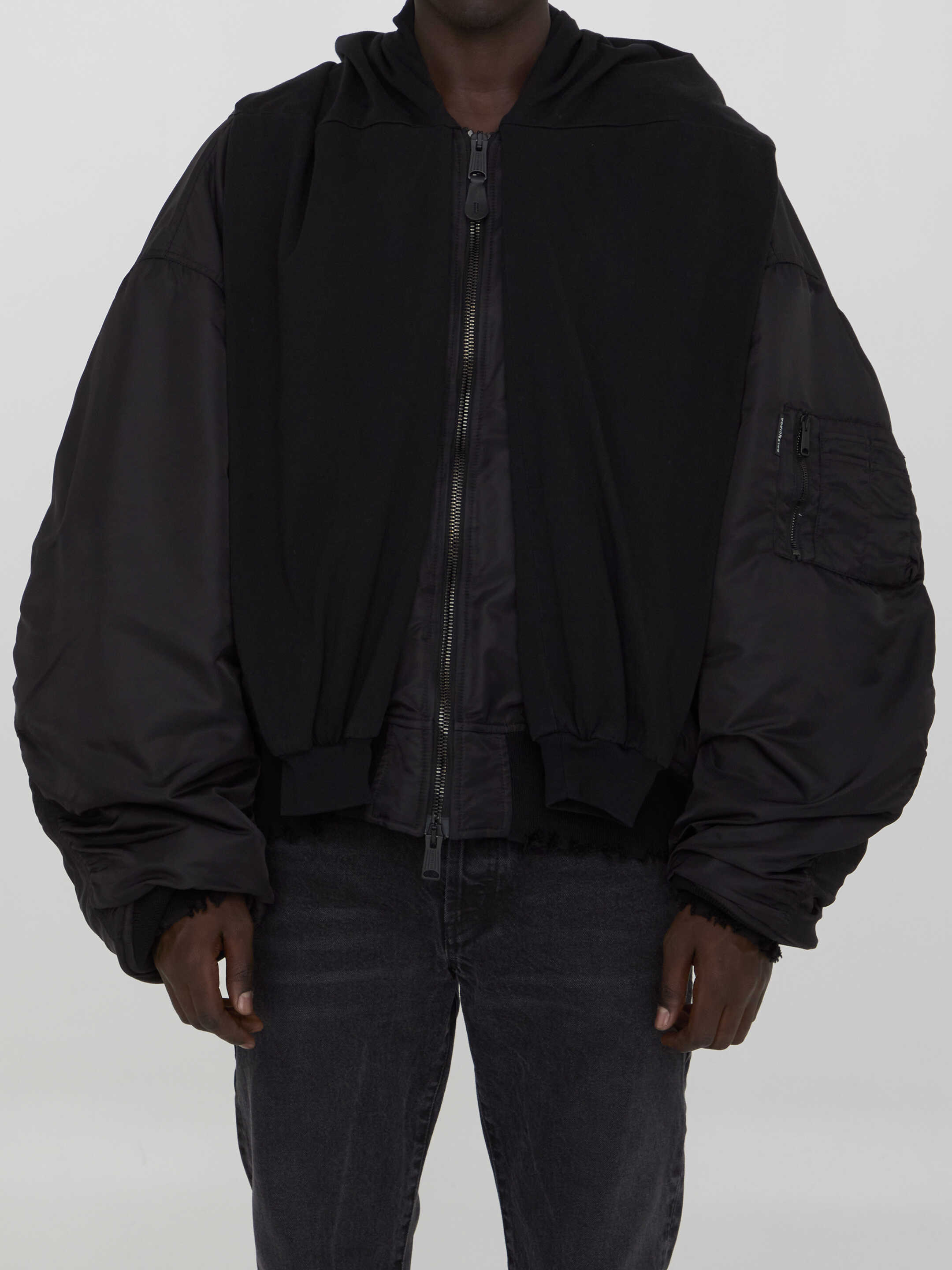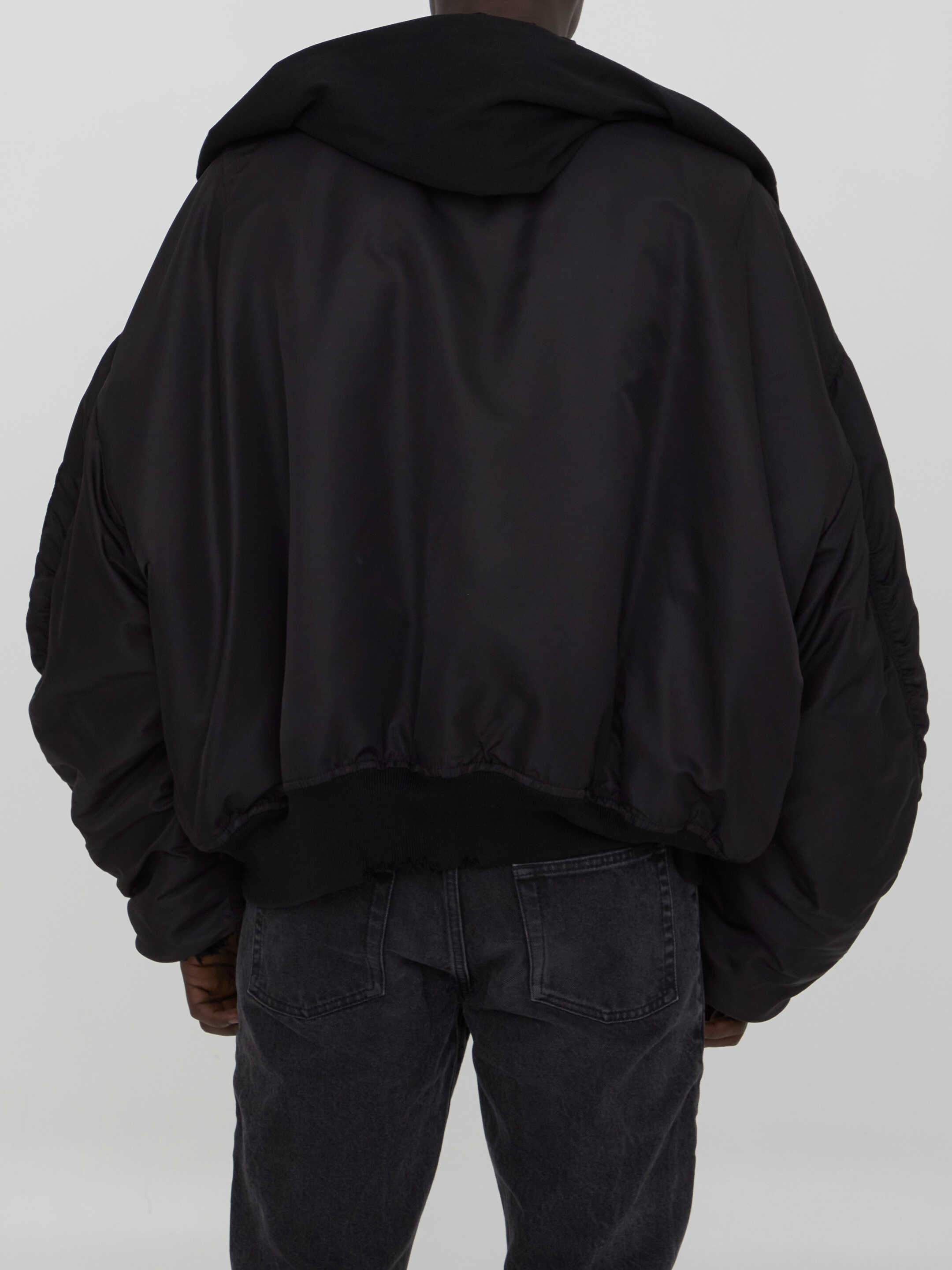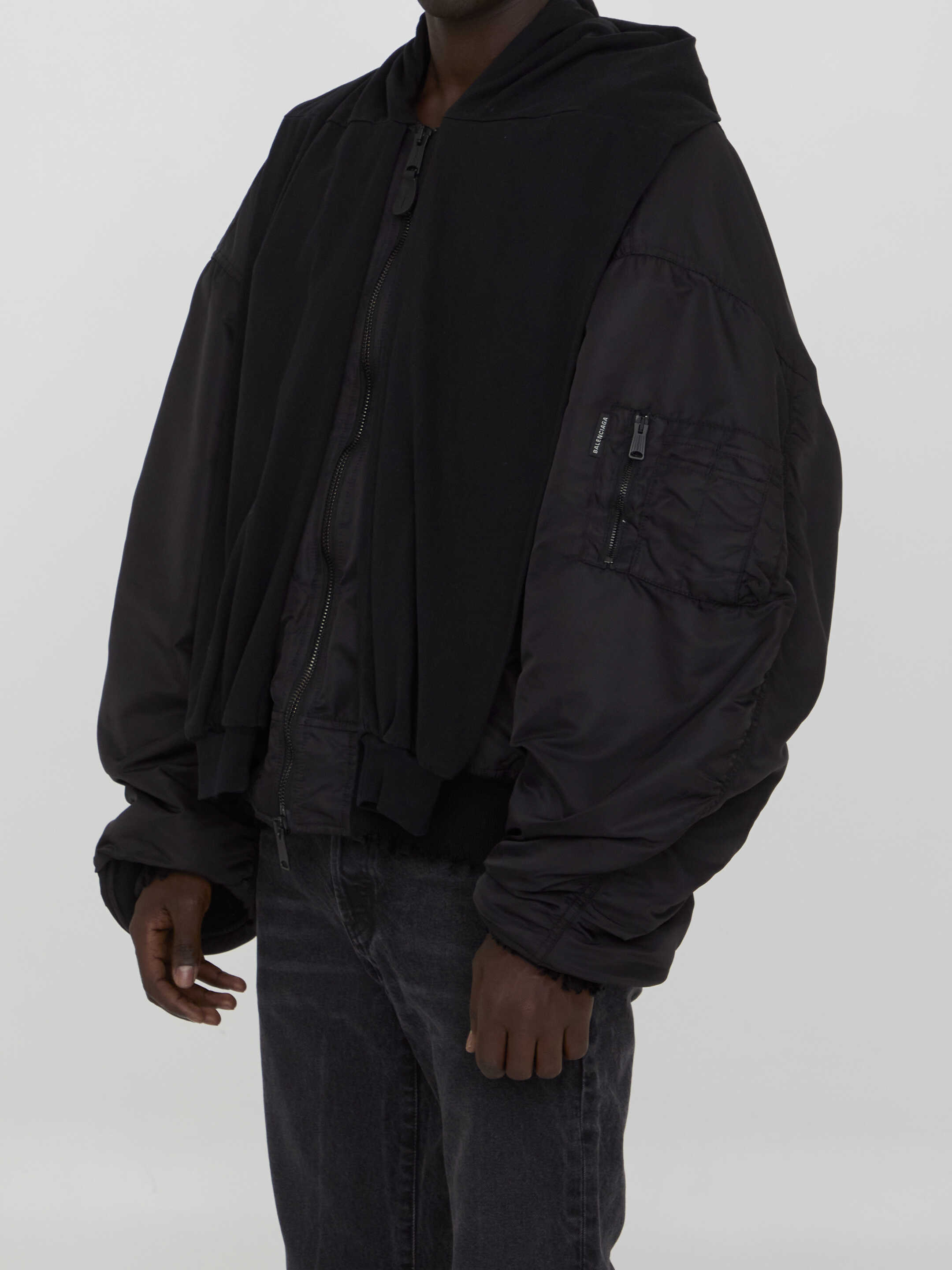 Incognito jacket in black nylon with inset long sleeve t-shirt that doubles as a hood. It features front two-way zip closure, two side press-stud flap pockets and knit trims. Destroyed effect. Oversized fit.