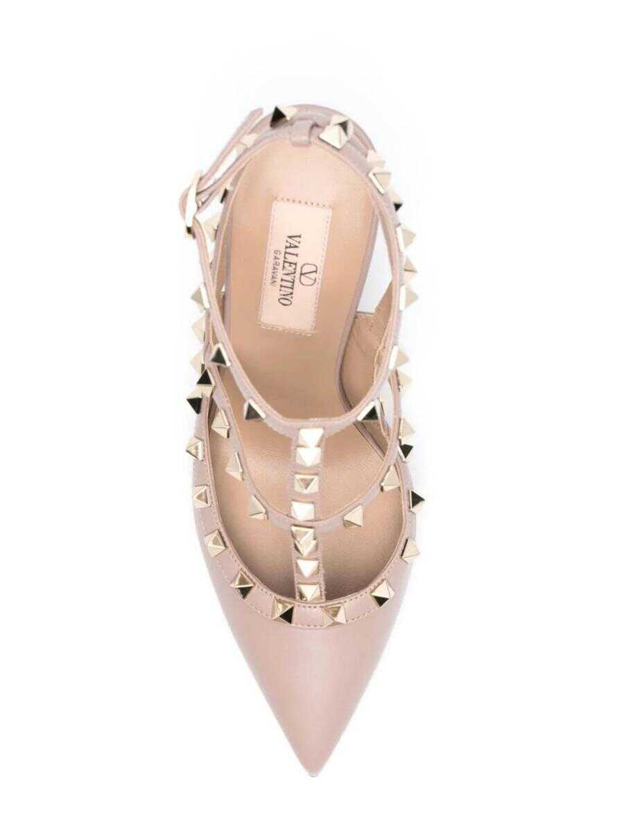 Slingback by Valentino Garavani made of smooth powder pink leather with profiles decorated with signature platinum-colored metal studs. Featuring an ankle strap with a metal buckle fastening, a sharp toe, leather lining and a leather sole. The covered stiletto heel completes the design