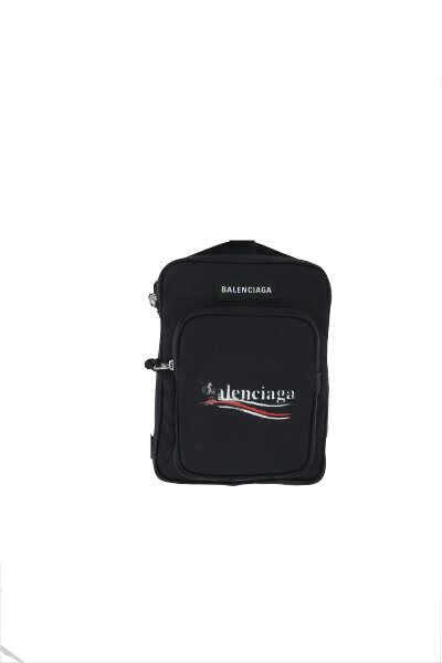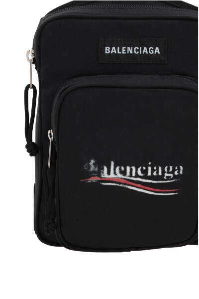 Balenciaga's crossbody messenger bag crafted in black recycled nylon with the iconic logo label on front. It features silver-tone hardware, zip closure and adjustable strap with snap-hook at the hem. Black canvas-lined interior. The design is completed by front zip pocket embellished by Political Campaign print.