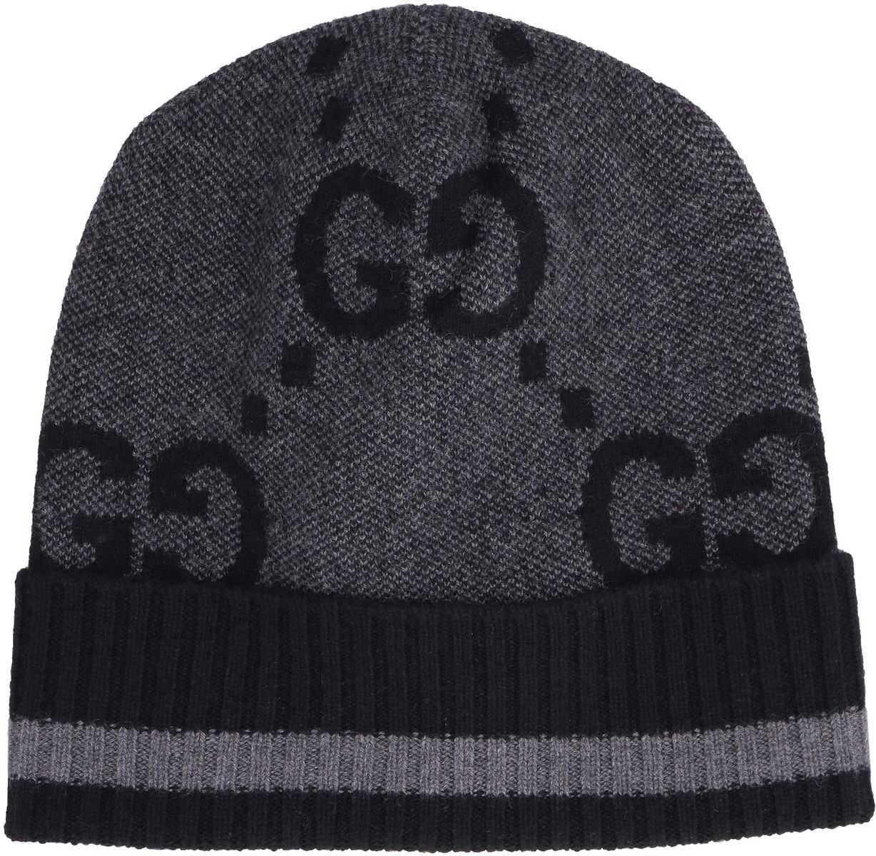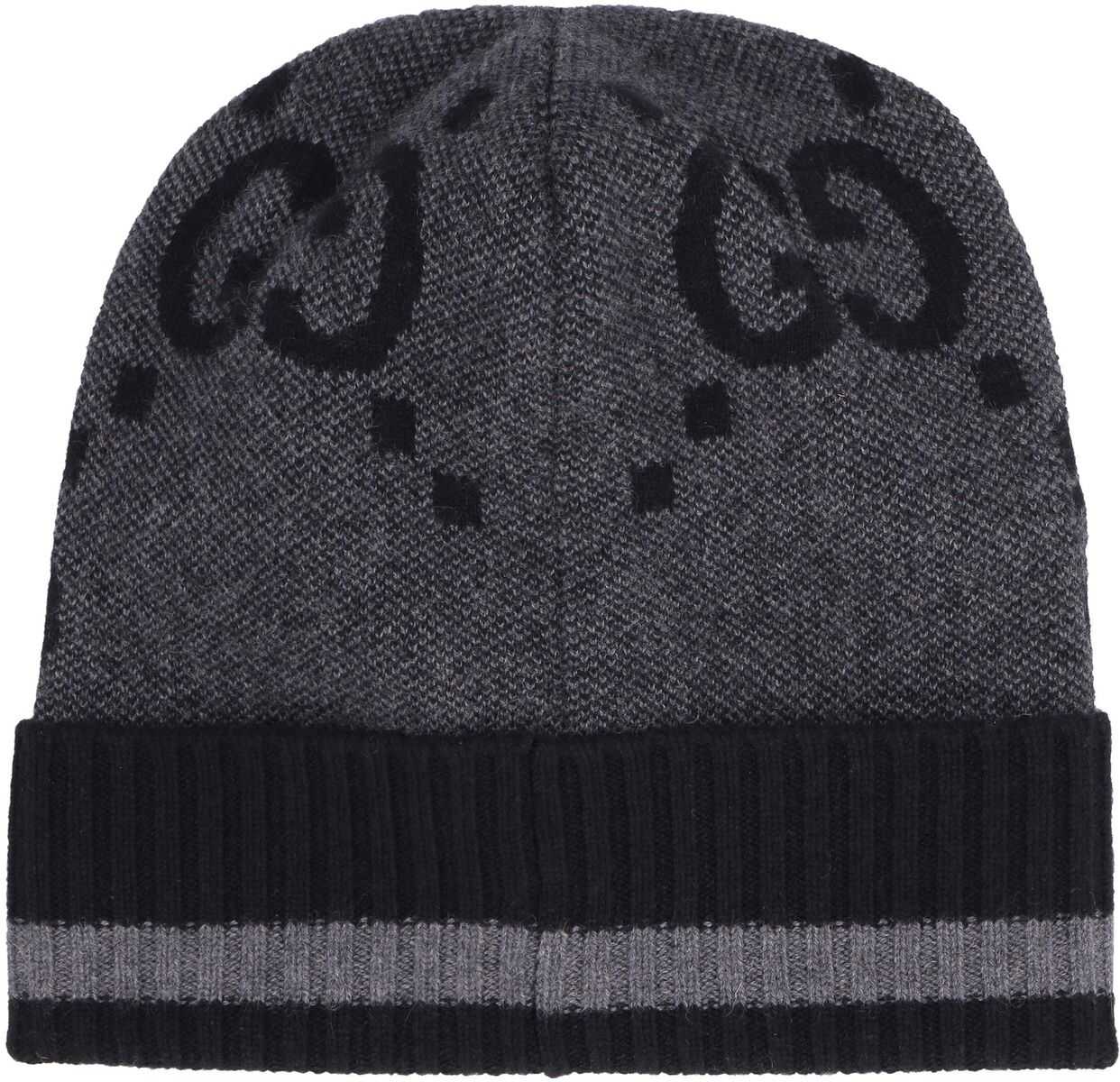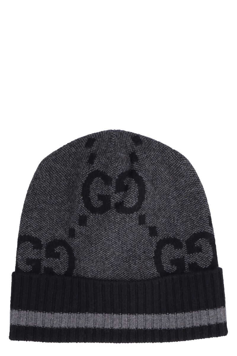 Black cashmere intarsia-knit logo beanie from GUCCI featuring intarsia-knit logo, ribbed detailing, stripe detailing and folded edge.