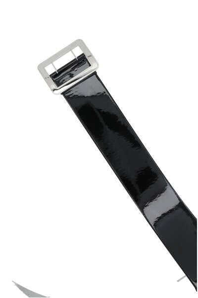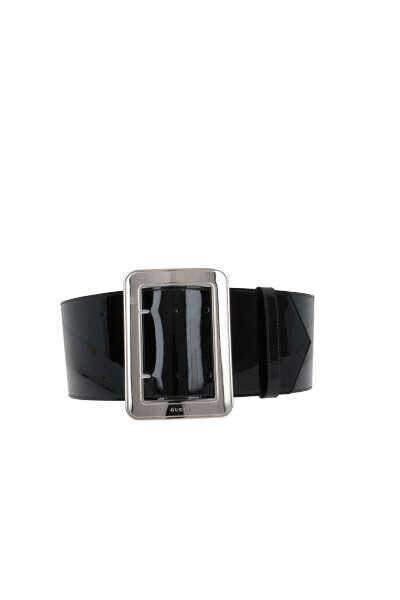 Gucci's waist belt crafted in black patent leather. It features adjustable closure with silver-tone metal buckle embellished by engraved logo lettering.