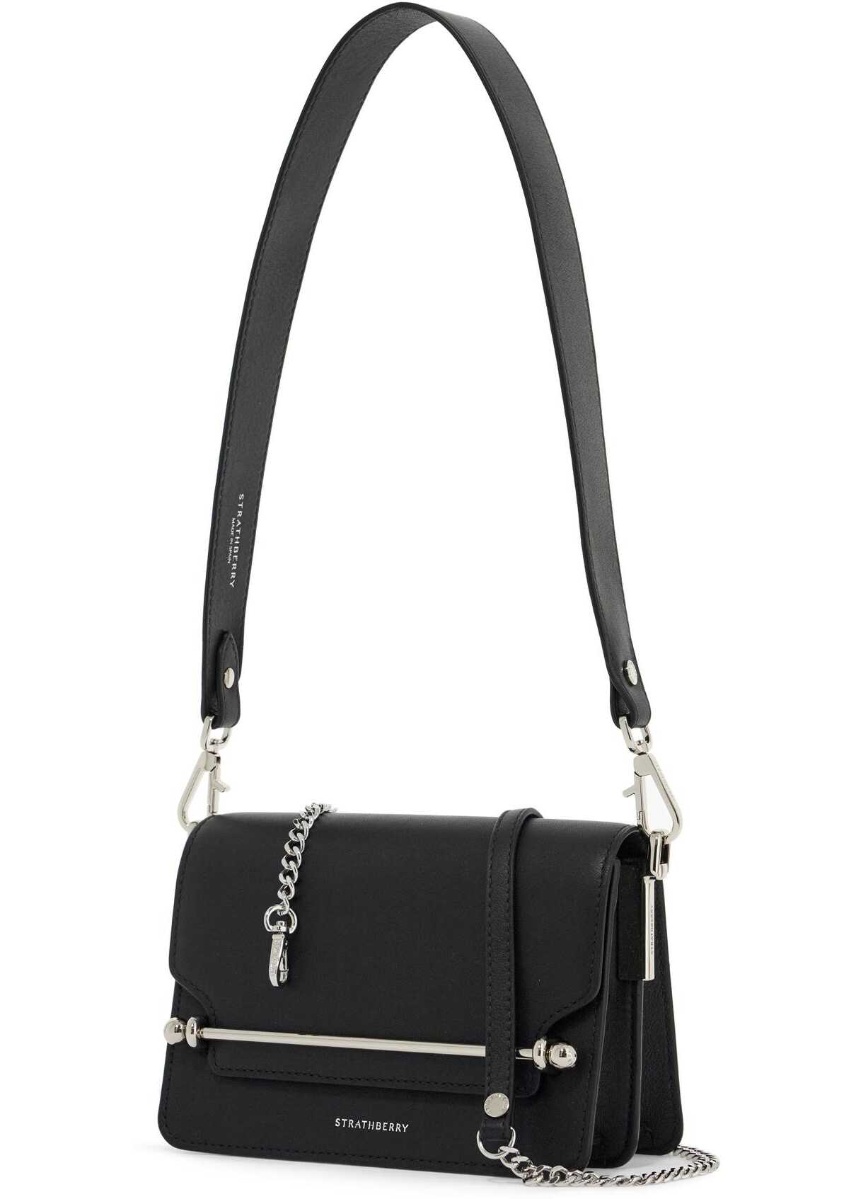 The Strathberry East/West multi-strap bag is handcrafted in calf leather and features the iconic metal bar with logo on the front. It has a flap closure with magnetic fastening, printed logo on the front, and a microfiber suede-lined interior with a flat pocket. The bag comes with both a removable handle and shoulder strap for a crossbody or shoulder look. The metallic accessories have a silver finish.