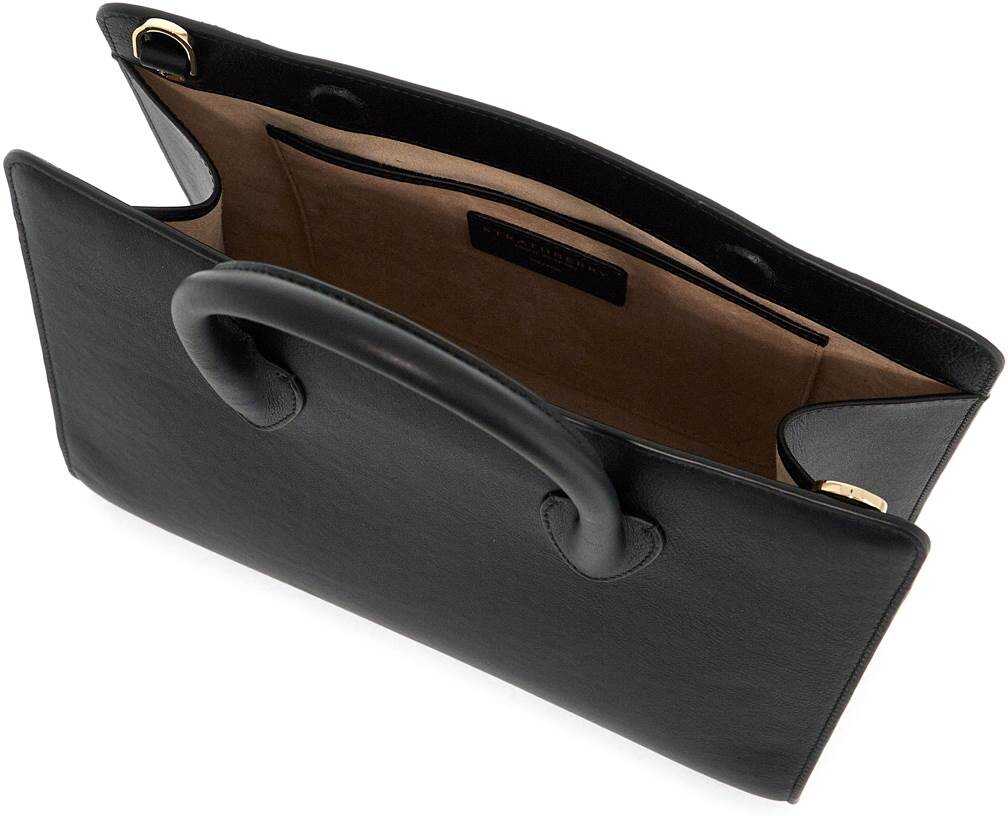 The Strathberry Midi Tote Bag is made of leather and features a classic bar closure that folds over the top handle. The interior is lined with suede microfiber and includes an open pocket and a zippered pocket, as well as protective feet at the base. The bag is accented with gold hardware for a touch of elegance.