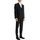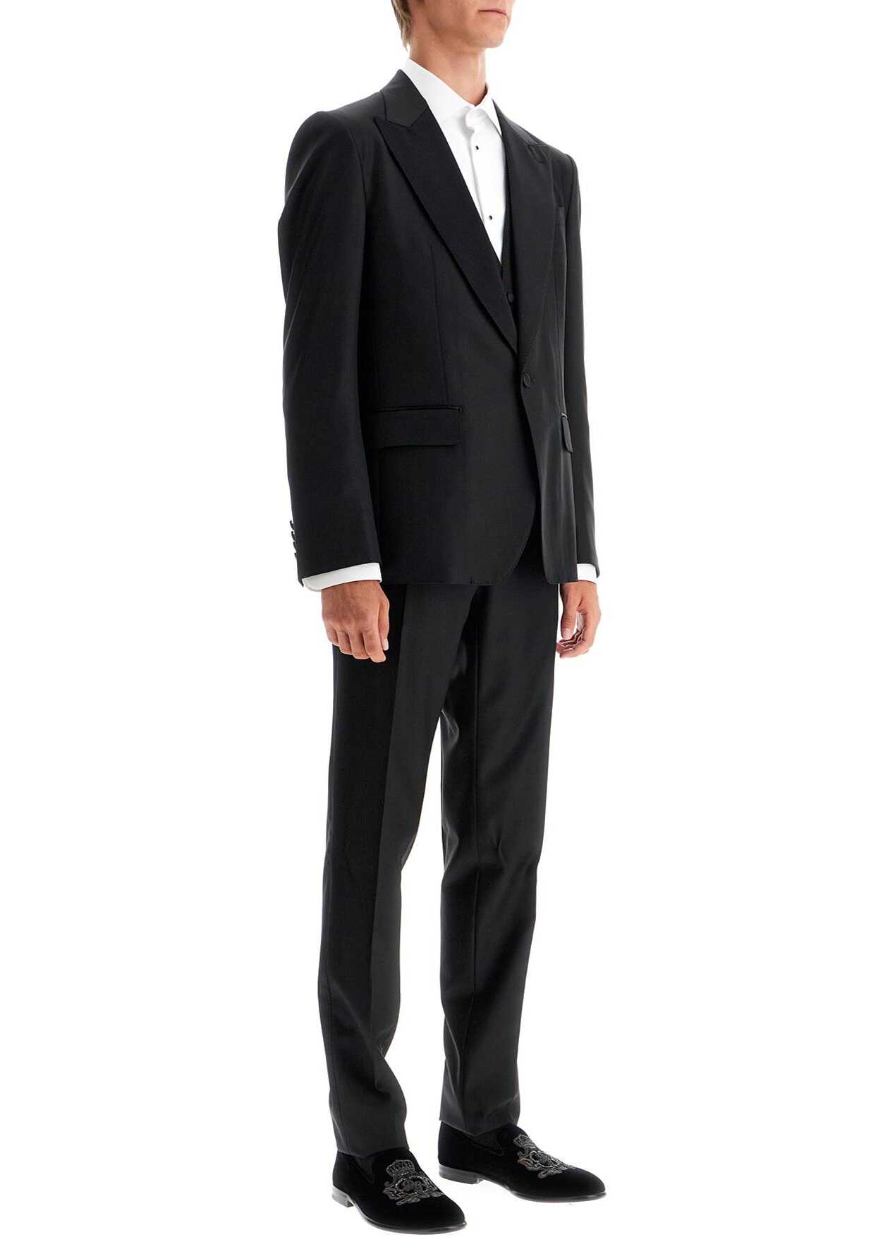 This two-piece Dolce & Gabbana tuxedo is made of wool gabardine with tonal silk satin finishes and hand-stitched details. The deconstructed jacket features a single-breasted one-button design with peak lapels, two flap pockets, a chest pocket, and a central back vent. It is fully lined and has two interior pockets. The cigarette-cut trousers have a low waist and pressed pleats, with four pockets including two on the waistband, belt loops, and