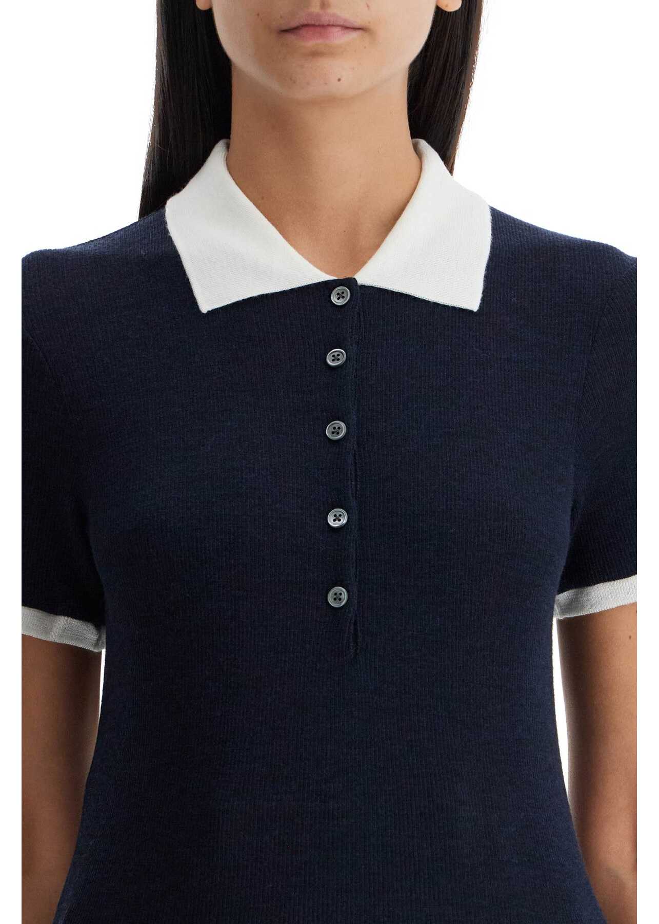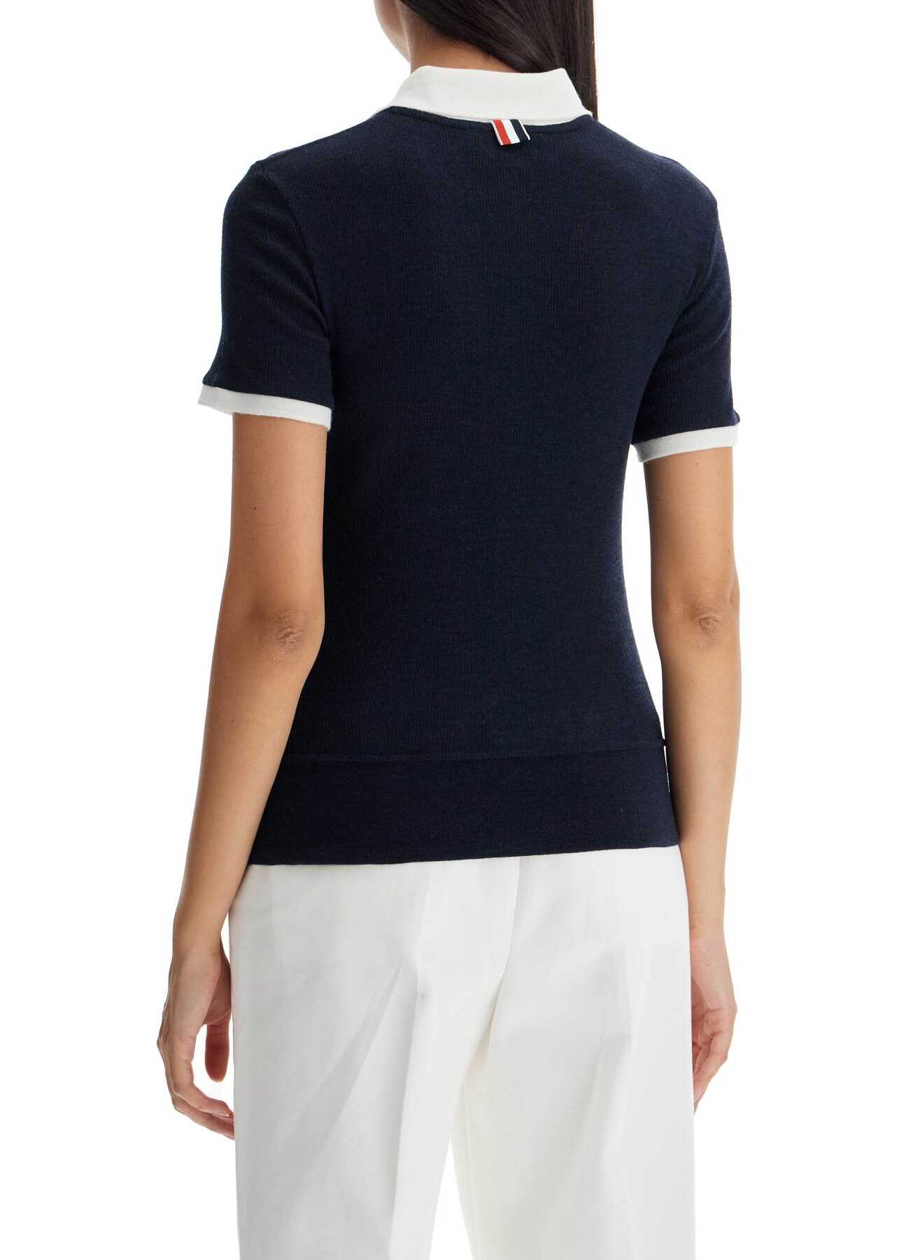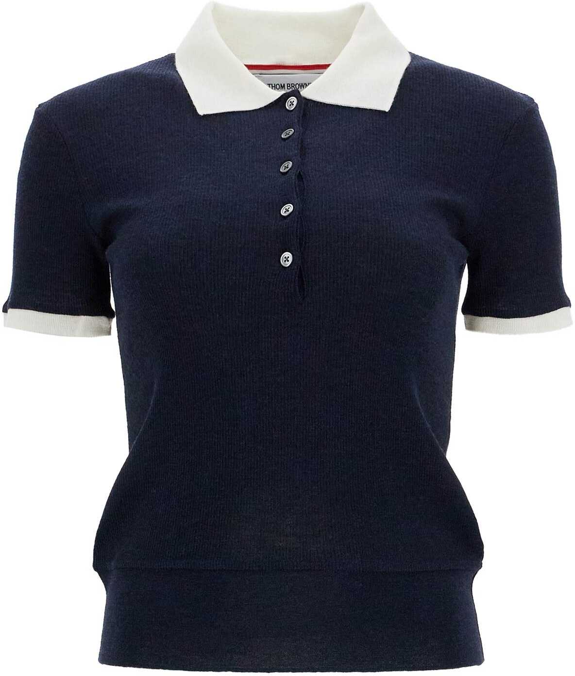 Thom Browne's polo-style shirt with a slim fit and short sleeves, made of lightweight ribbed wool with contrasting collar and sleeve cuffs. The garment is completed by a five-button closure and the iconic RWB tab on the back of the neck. The model is 177 cm tall and wears size IT 40.