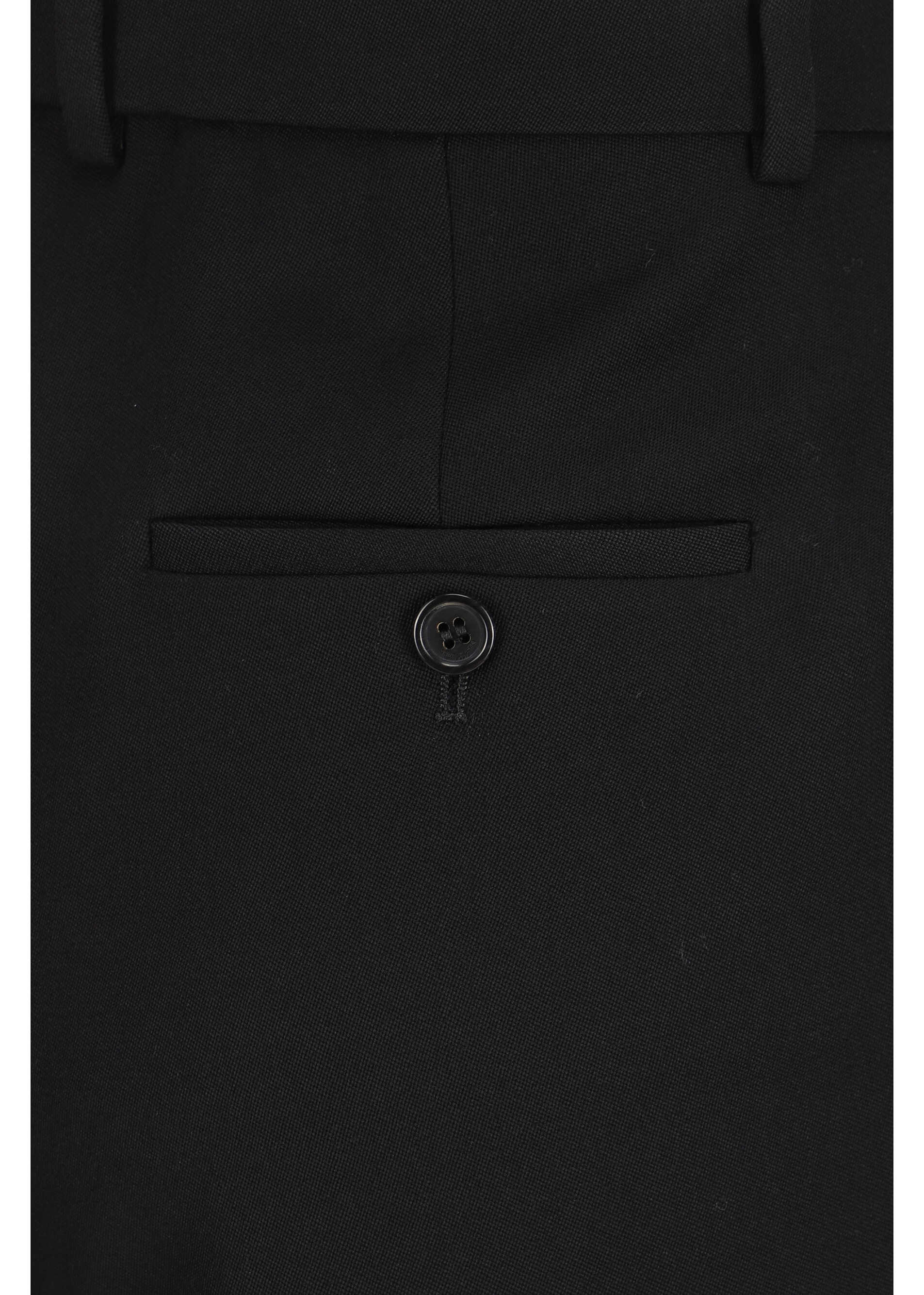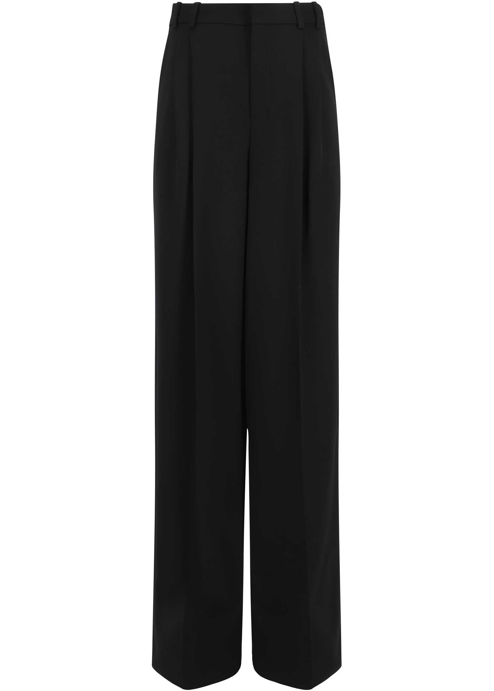 Wool Pants by Saint Laurent, high-waisted, wide-leg style, two side welt pockets, two back slit pockets, button and zipper front closure, waistband loops, monochrome pattern.