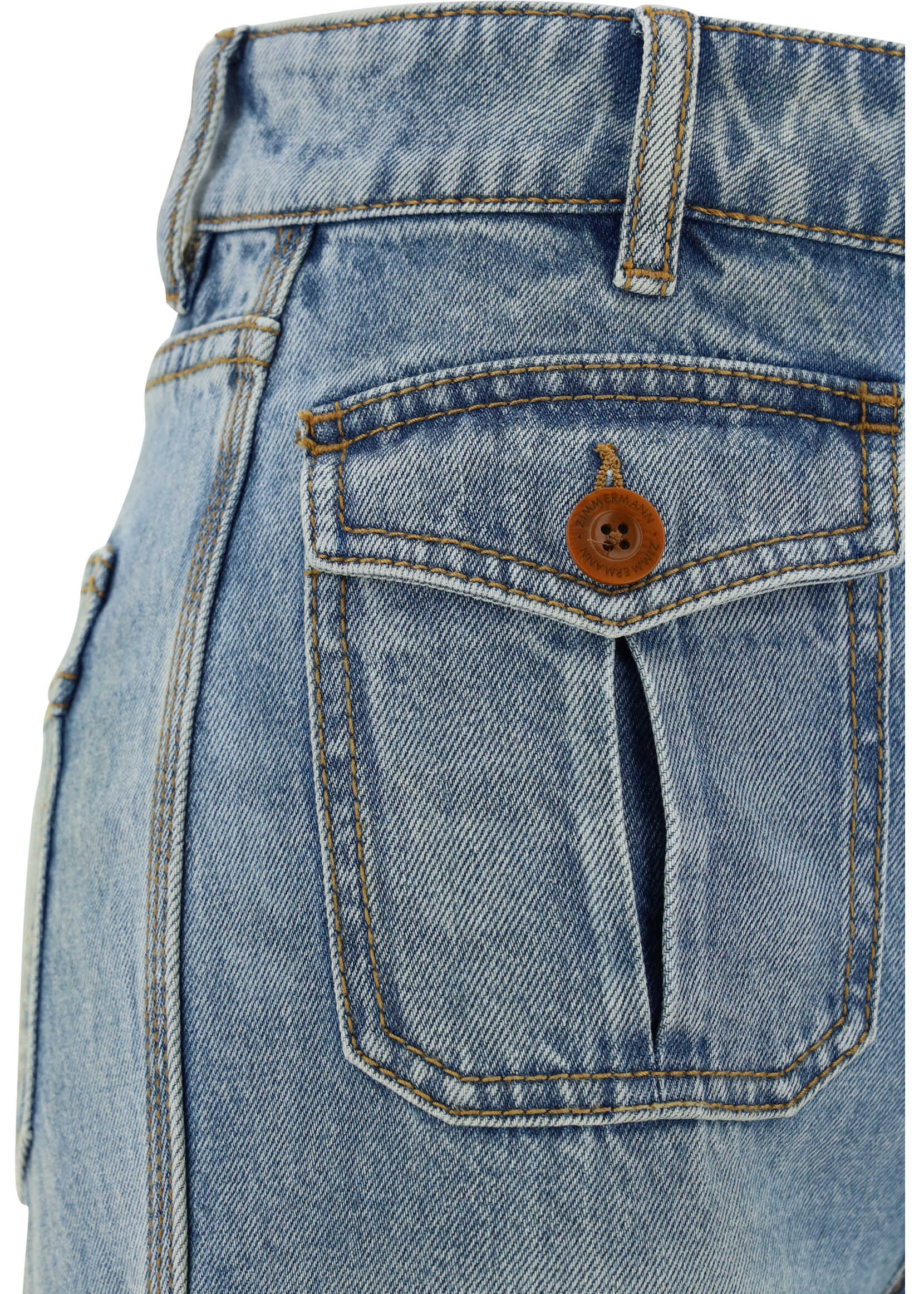 Cotton Flare Jeans by Zimmermann, flare boot-cut style, two large patch pockets on front panel with flap for closure, two slit pockets on back, front button and zipper closure, belt loops waistband, iconic leather patch with signature brand printed pressure applique on back.